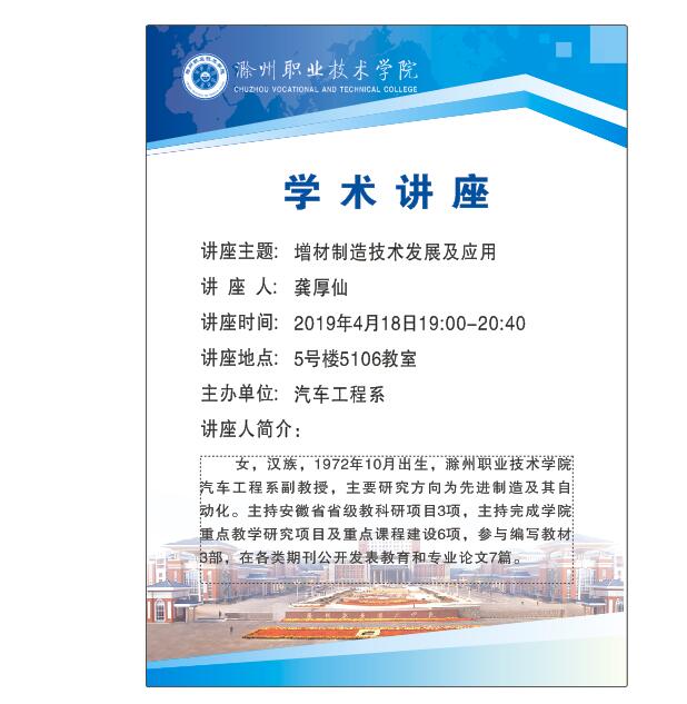 龚厚仙,女,汉族,1972年10月出生,金沙威尼斯欢乐娱人城汽车工程系副教授,主要研究方向为先进制造及其自动化。主持安徽省省级教科研项目3项,主持完成学院重点教学研究项目及重点课程建设6项,参与编写教材3部,在各类期刊公开发表教育和专业论文7篇。