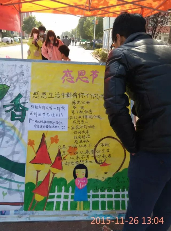 11月26日上午,食品系花艺社主办的“情系暖冬”感恩主题活动在宿舍区展开。活动通过“给远方的他(她)写一封信”、“送老师一支康乃馨”、“感恩留言墙”等形式,面向全院同学开展感恩教育。