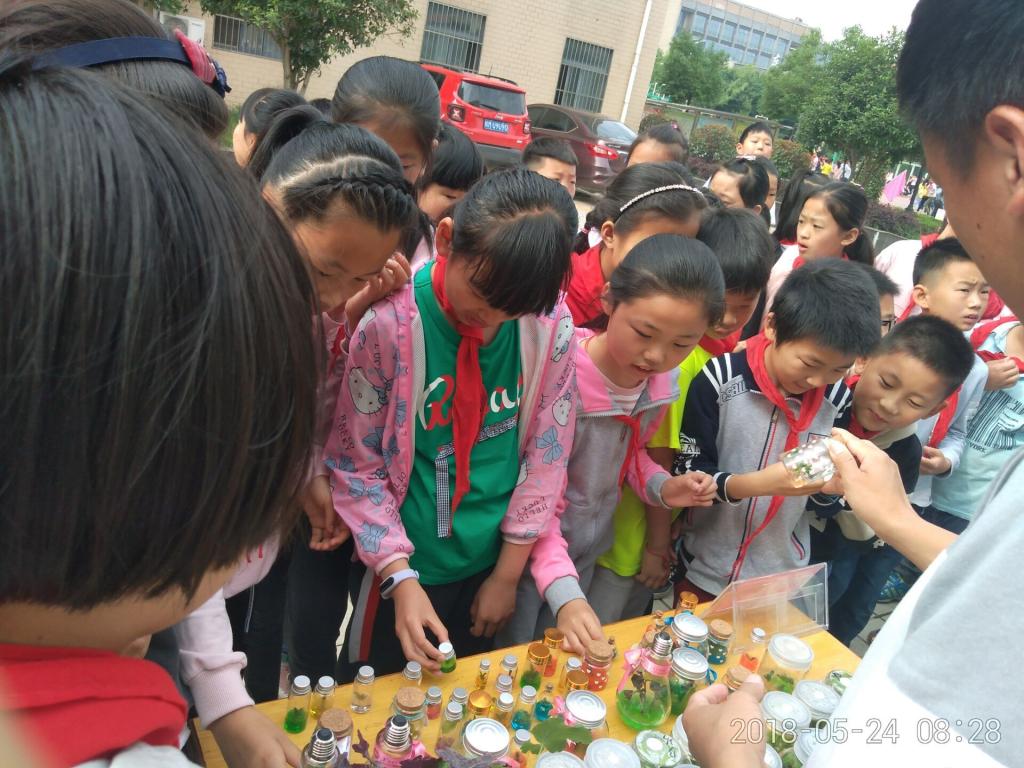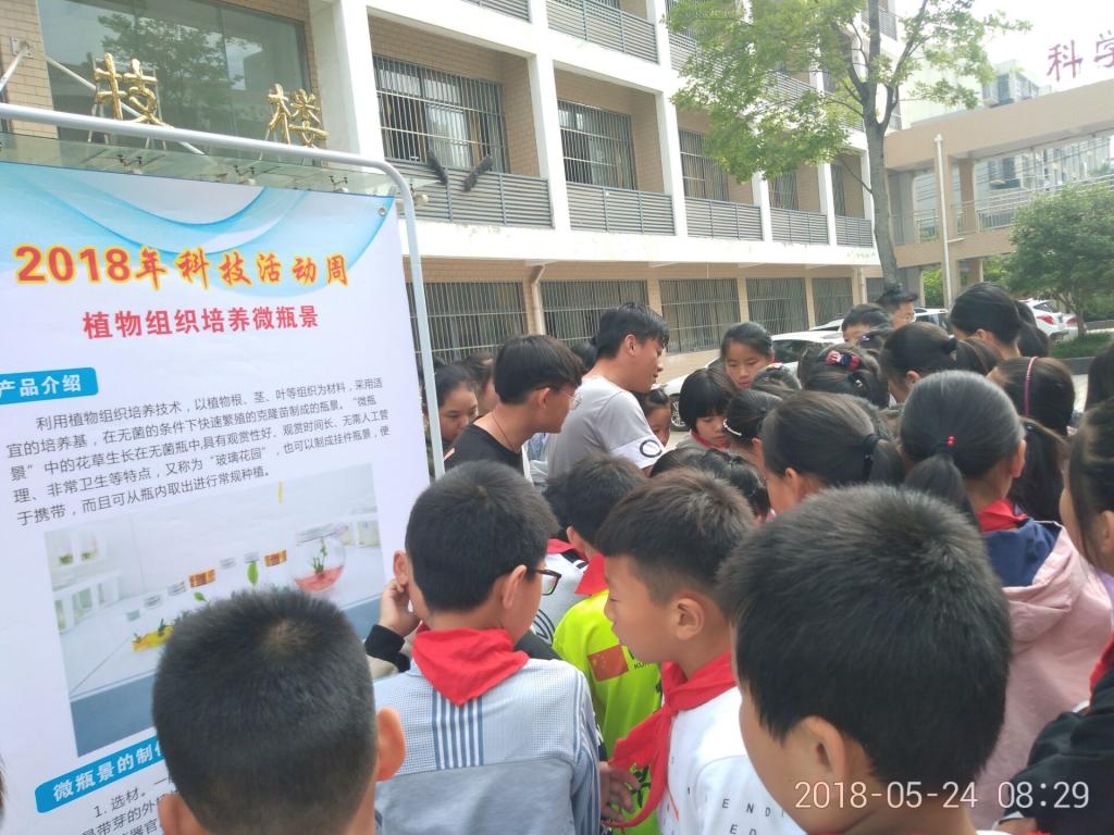 524日上午,该团队将微瓶景在龙蟠小学展出,小学生们对微瓶景、植物组织培养表现出浓厚的兴趣。下午开放实验室,把2202组培实验室对龙蟠小学的学生开放,传播科技知识,培养科技的种子,面对好奇的学生,诸多的提问,薛正帅老师和傅竞、葛文安同学耐心讲解,给小学生们做了一场生动的植物组织培养技术的科普教育。