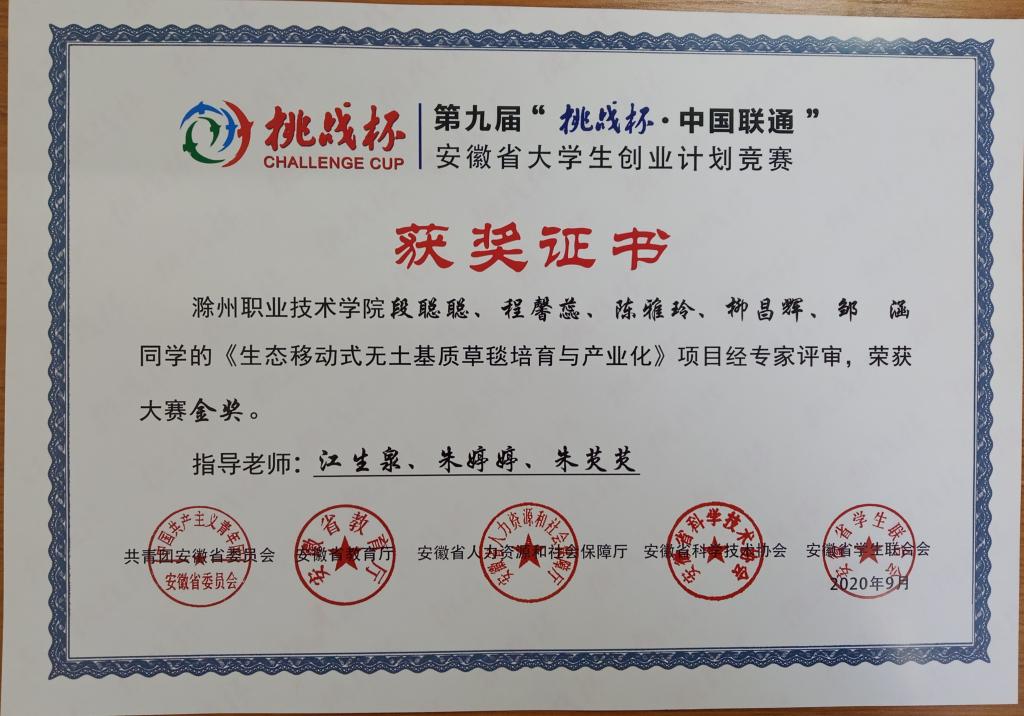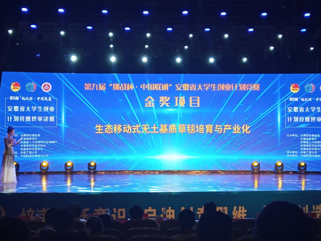 9月5日至7日,第九届“挑战杯.中国联通”安徽省大学生创业计划竞赛终审决赛在安徽工程大学隆重举行。金沙威尼斯官网食品与环境工程学院18园林2班段聪聪、程馨蕊、陈雅玲、柳昌辉、邹涵同学的“生态移动式无土基质草毯培育及产业化项目”经过校赛、省赛初赛及终审决赛多轮紧张角逐,最终荣获大赛金奖,并顺利晋级国赛。该金奖也是生态环保和可持续发展组别中唯一获金奖的高职院校,其项目产品也受到评委专家及领导的充分肯定。