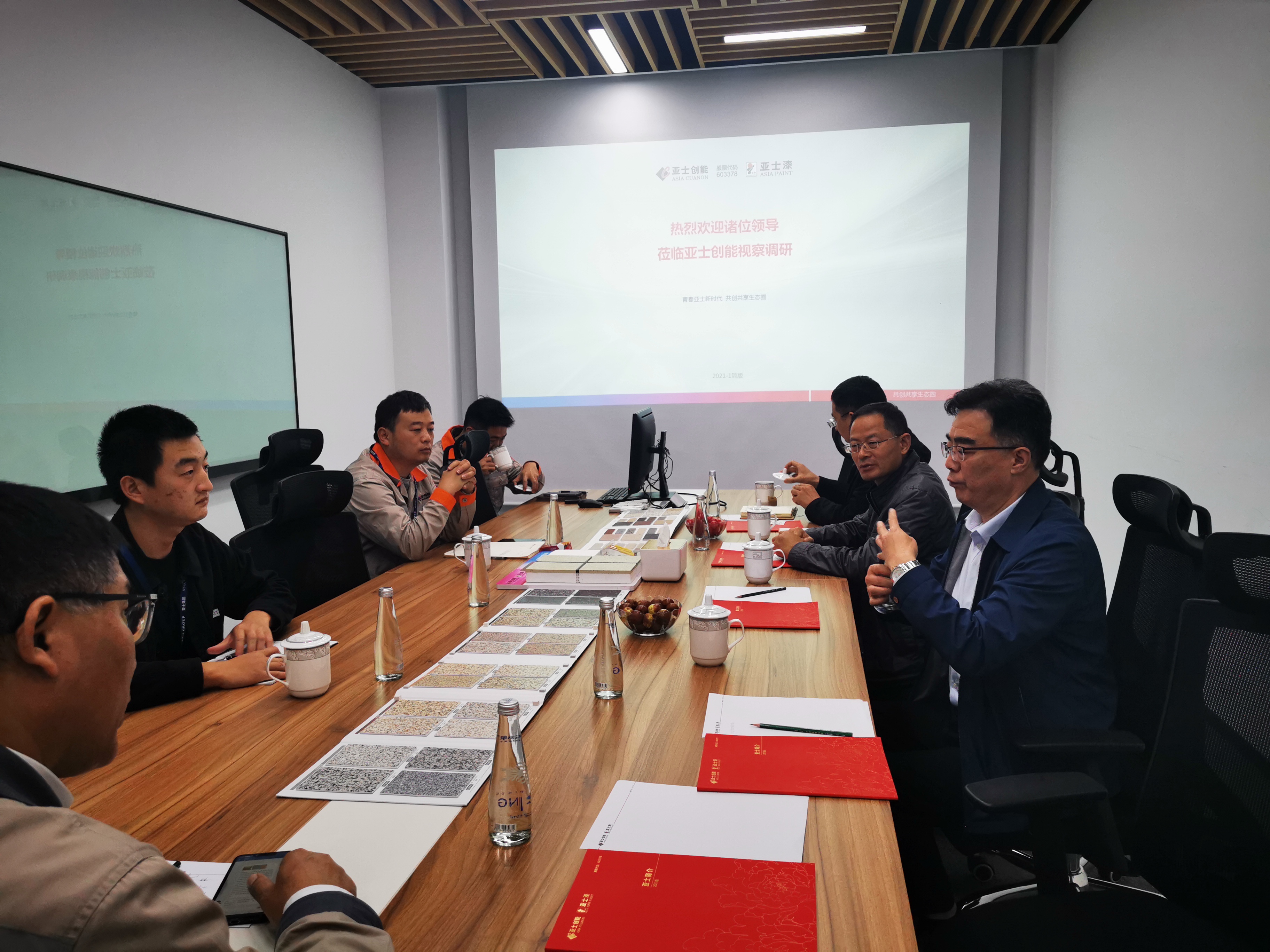 在两家企业分别进行了参观和座谈。在座谈会上,企业负责人首先分享了企业发展历程、企业文化,介绍了企业发展情况及合作设想。全椒亚格泰电子新材料科技有限公司成立于2018年,位于安徽省滁州市全椒县十谭电子新材料产业园化工集中区内。生产的产品为高纯电子化学品类的材料,主要应用于集成电路、光伏、LED、平板显示等电子行业。亚氏创能科技(滁州)有限公司位于安徽省滁州市全椒县经济技术开发区,公司总占地面积约 381 亩,总投资约 10 亿元,覆盖亚士创能四大业务块、六大产品体系的综合制造基地,是目前国内单体最大、最先进的涂料和保温生产基地。