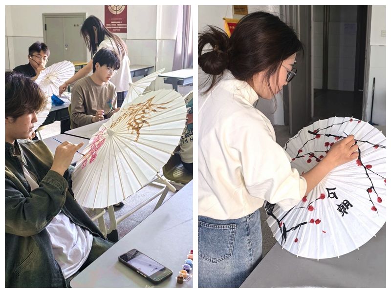 活动现场,同学们巧妙地将山水,花鸟、人物等中国传统元素融入到每一把油纸伞中,赋予这些古老工艺品全新的生命力。学生们充分地发挥自己的想象力,用画笔在油纸伞上勾勒出美丽的图案,而当绘画遇到纸伞,创意与灵魂的碰撞带给大家美妙的视觉盛宴。他们有的挥毫泼墨,绘制出细腻入微的自然风光;有的大胆创新,将现代图案与传统文化相结合,展现出古老交融的新风尚。一把把油纸伞,古典怀旧,寓意吉祥,让同学们在快节奏的学习、生活中寻找到一丝精神的慰藉,感受传统文化的魅力。