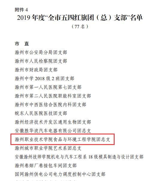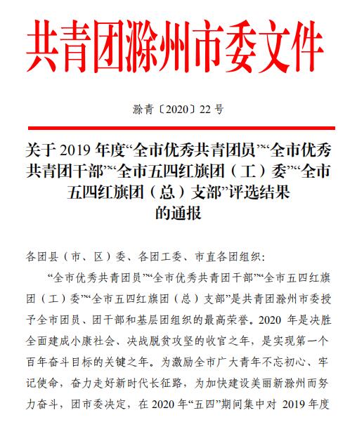 近日,共青团滁州市委发布了《关于2019年度“全市优秀共青团员”“全市优秀共青团干部”“全市五四红旗团(工)委”“全市五四红旗团(总)支部”评选结果的通报》。我院团总支荣获“滁州市五四红旗团(总)支部”荣誉称号。