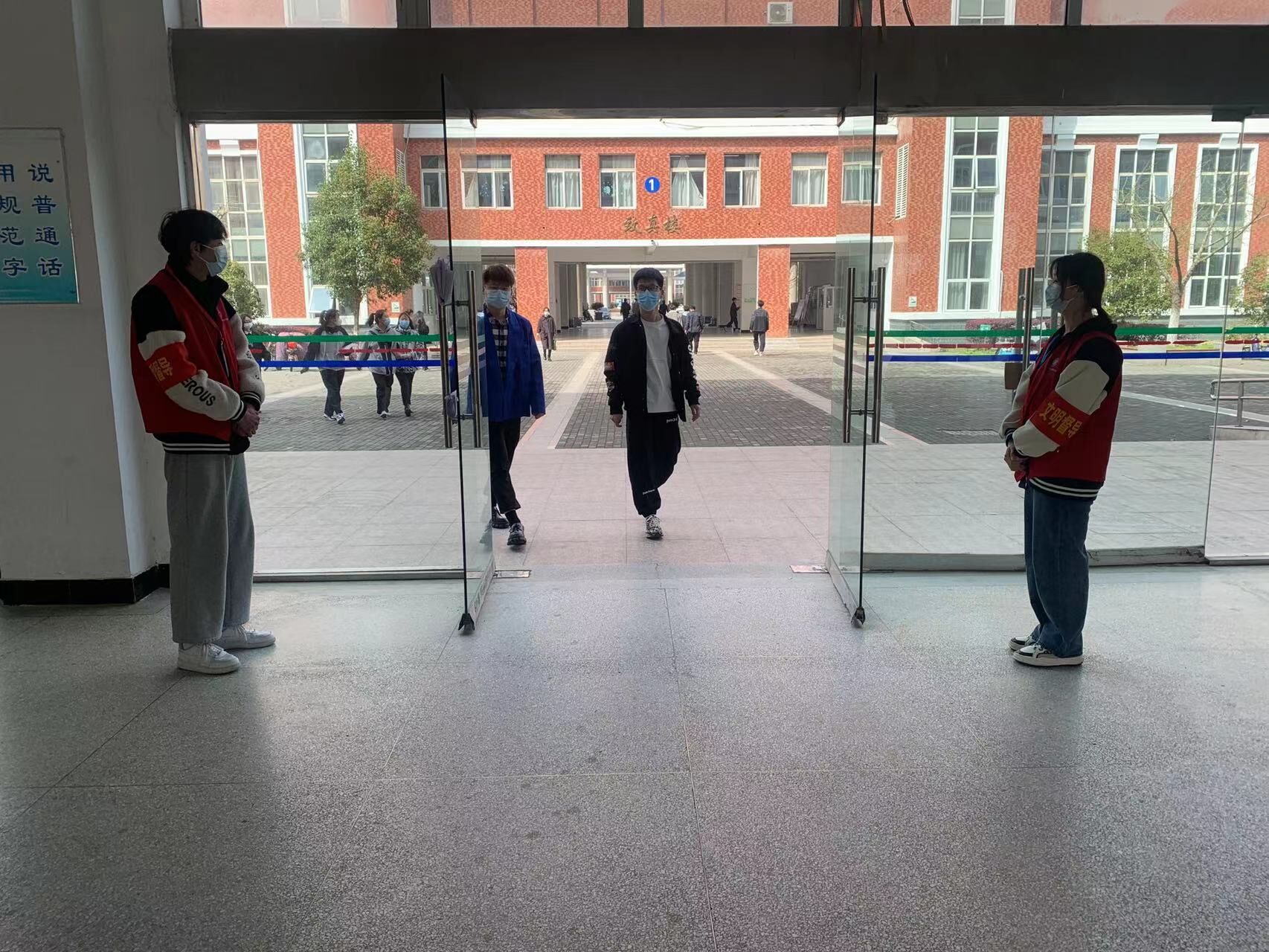 志愿者们穿上红马甲,在学校东门口开展疫情防控志愿服务工作,提醒进出师生佩戴好口罩,核查进出人员的安康码、出入证、行程码并测体温,做好信息登记。在教学楼,入党积极分子戴上红袖章,提醒来往学生戴好口罩,做好个人防护。一张张年轻的脸庞,一件件火红的马甲,树立起一面面鲜红的青年志愿者旗帜,为疫情防控一线带来一抹青春色彩,有力彰显了我院新时代青年的力量与担当。