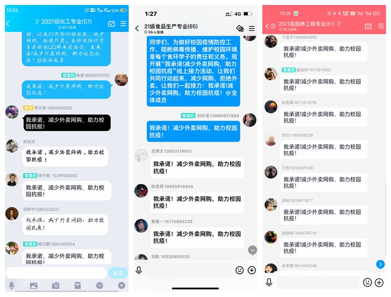 团总支积极在微信公众号发出“减外卖少网购,共携手防输入”的倡议;各班级在QQ群、微信群等网络平台发出“我承诺!减少外卖网购,助力校园抗疫”的线上接力承诺。