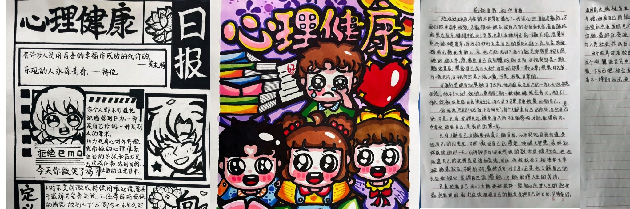本次活动分为文章和绘画两部分,共收到参赛作品八十余份,选手们提交的作品都紧靠“悦纳自我,相伴青春主题”主题,内容通俗易懂,语言表达规范,色彩丰富绚丽。其中,徐颖同学的画作采用黑白结合的方式,表达了乐观向上,积极面对生活的人生态度。方友晨同学的画作内容生动有趣,刻画出面对失败也不要气馁,而要笑对挫折的卡通人物形象。王思邑同学的文章贴合本次活动主题,表达出了欣赏自我、相信自我才是最好的生活方式。
