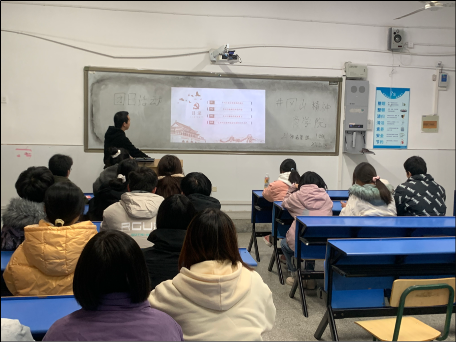 活动首先由班长王靖威对班会的流程及秩序先进行了简单介绍。随后,通过播放励志短片向同学们展现井冈山精神的历史形成、基本内涵与内在学习价值。同时用PPT展示的方式向同学们介绍了黄继光的英雄事迹,黄继光用胸膛抵住喷火枪口,用生命直面冰冷死亡,一身硬骨头满腔赤诚血,21岁的黄继光活着是一面旗帜,倒下是一座丰碑,通过了解英雄不怕牺牲的精神进一步增强同学们的思想政治觉悟和爱国主义精神。团支书张志超表示:“我们要向革命先烈表示崇高的敬意,要永远怀念他们、牢记他们,传承好他们的红色基因,不畏艰苦,发扬光大。”