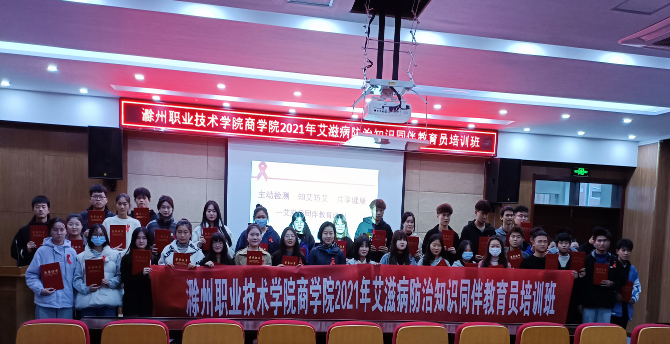 滁州疾控中心的黄科长首先邀请了几名同学回答“你对艾滋病有什么看法?说说你的观点”这个问题,有的同学觉得艾滋病特别可怕,应该正视它预防它。有的同学认为艾滋病距离自己很遥远,所以意识层面还不是很重视。有的同学将艾滋病与同性恋画等号。认为艾滋病只在同性恋中传播。随后黄科长就同学们的回答进行点评,她表达我们应该以平常心去友好的对待艾滋病患者,要更加正确的看待艾滋病毒,做到不歧视、不偏见。.艾滋病感染途径有三条,就传染病而言,艾滋病的感染性并不算强,艾滋病病毒不会通过飞沫、水源、家禽家畜传播,礼节性接吻、拥抱、贴面礼、握手、一起吃饭、共用马桶等日常接触不会传染。此外艾滋病毒在同性之间的出现率极高,尤其是男性,所以应该充分重视这个问题,要使用安全套,防患于未然。当然,我们在关爱艾滋病病毒感染者和病人的同时,也要洁身自好,预防被艾滋病病毒感染。最后,大家在宣传条幅上签名,合影留念,为本次培训会画上完美的句号。