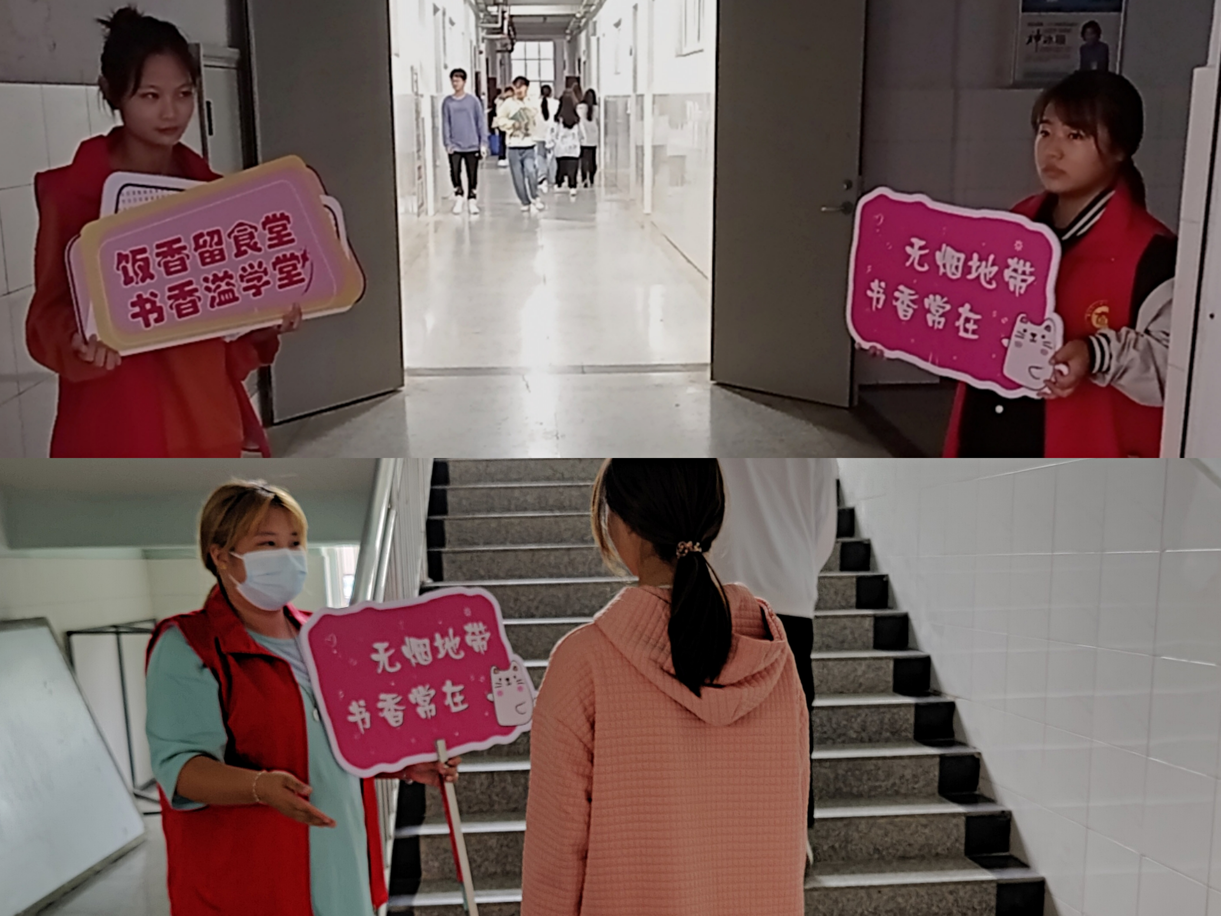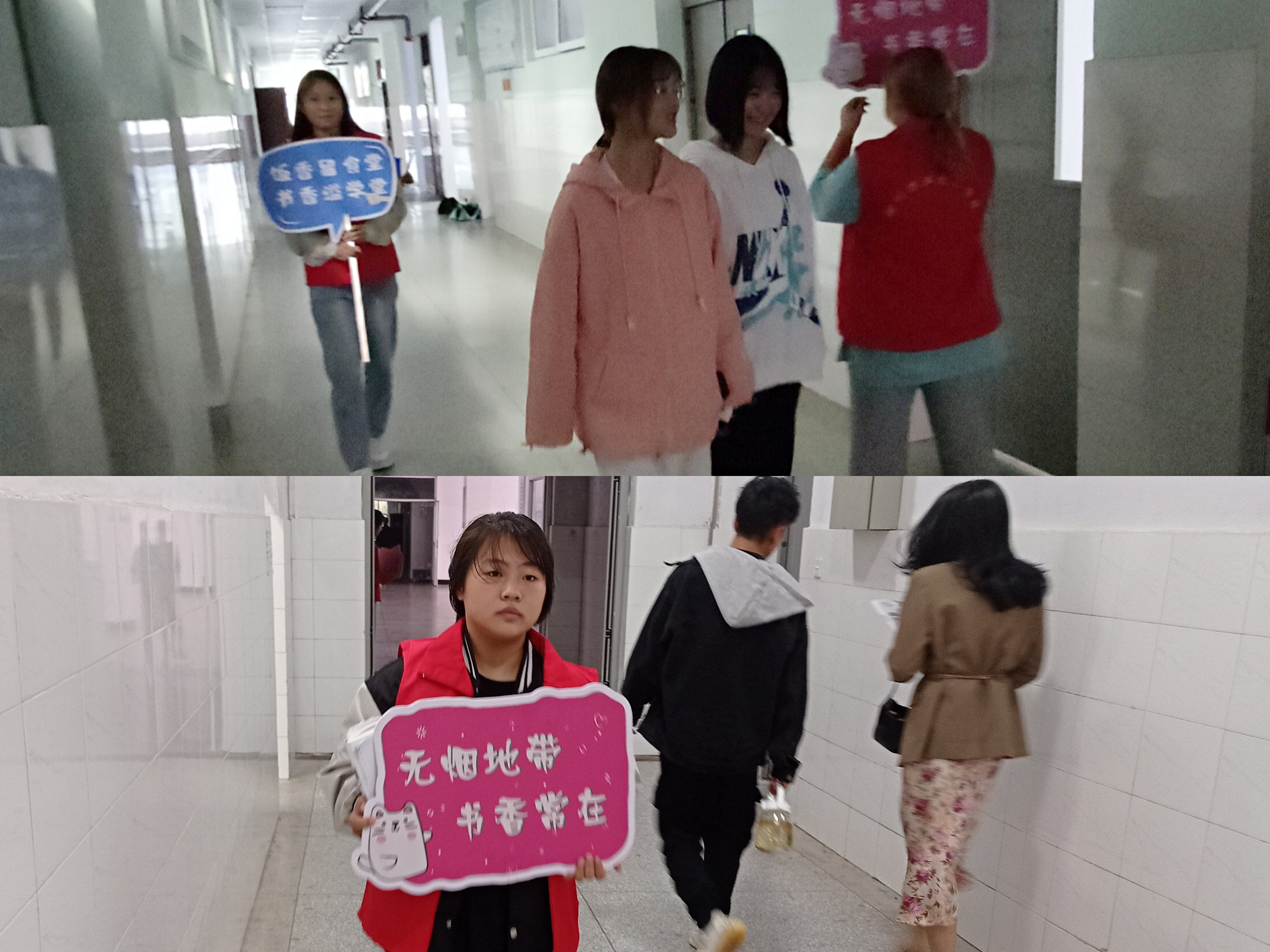 为争创省级文明校园,给全体师生创建一个无烟、清洁、健康的和谐校园环境,商学院安排志愿者在教室、寝室楼道进行巡查,对学校禁烟和饭香留食堂进行宣传。