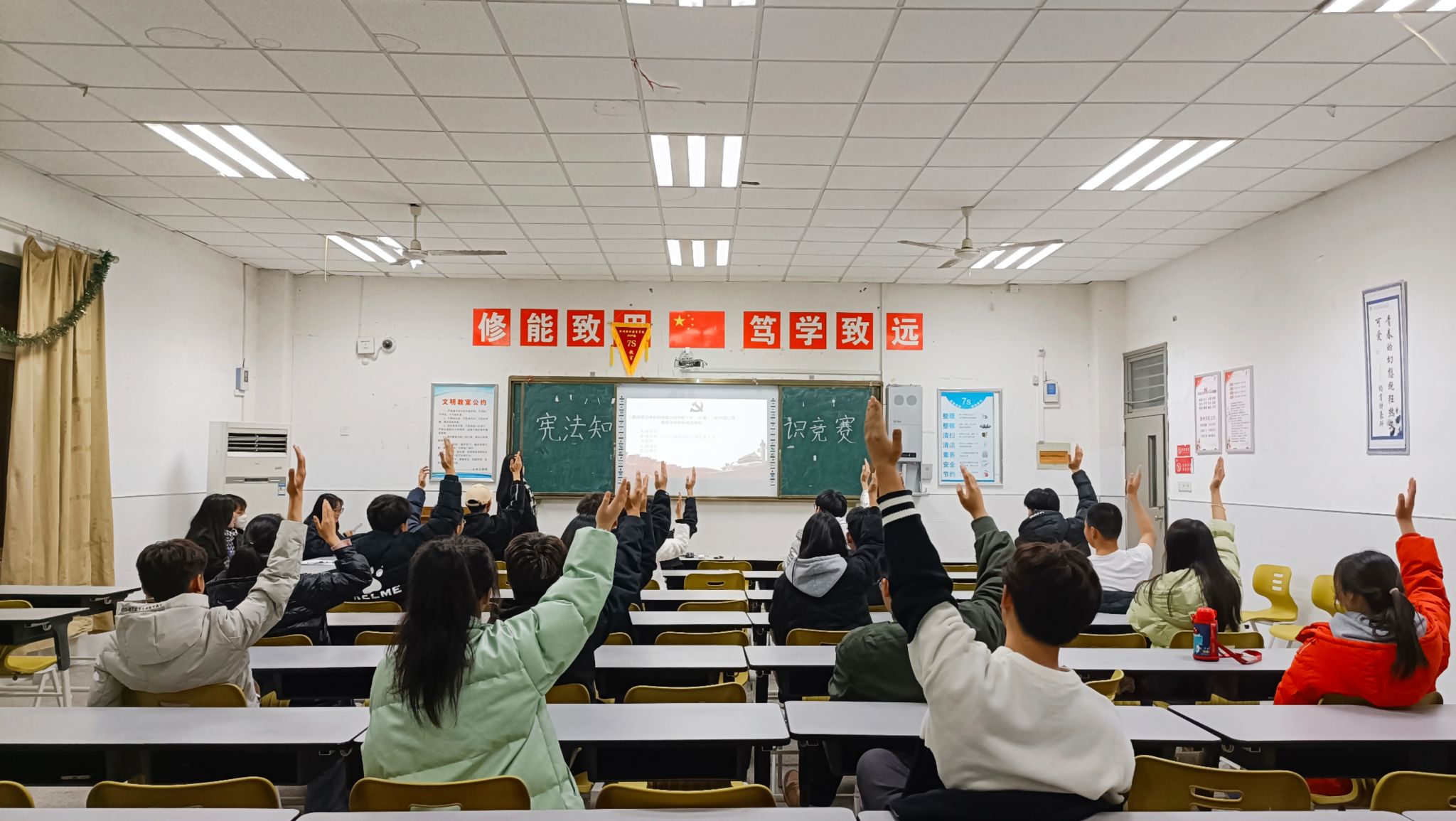 活动内容涵盖了《中华人民共和国宪法》、《中华人民共和国全国人民代表大会和地方各级人民代表大会选举法》等相关法律知识。在比赛中,同学们积极参与并了解了全国人民代表大会、宪法内容、警惕电信网络诈骗、劳动合同的订立与解除等相关内容。