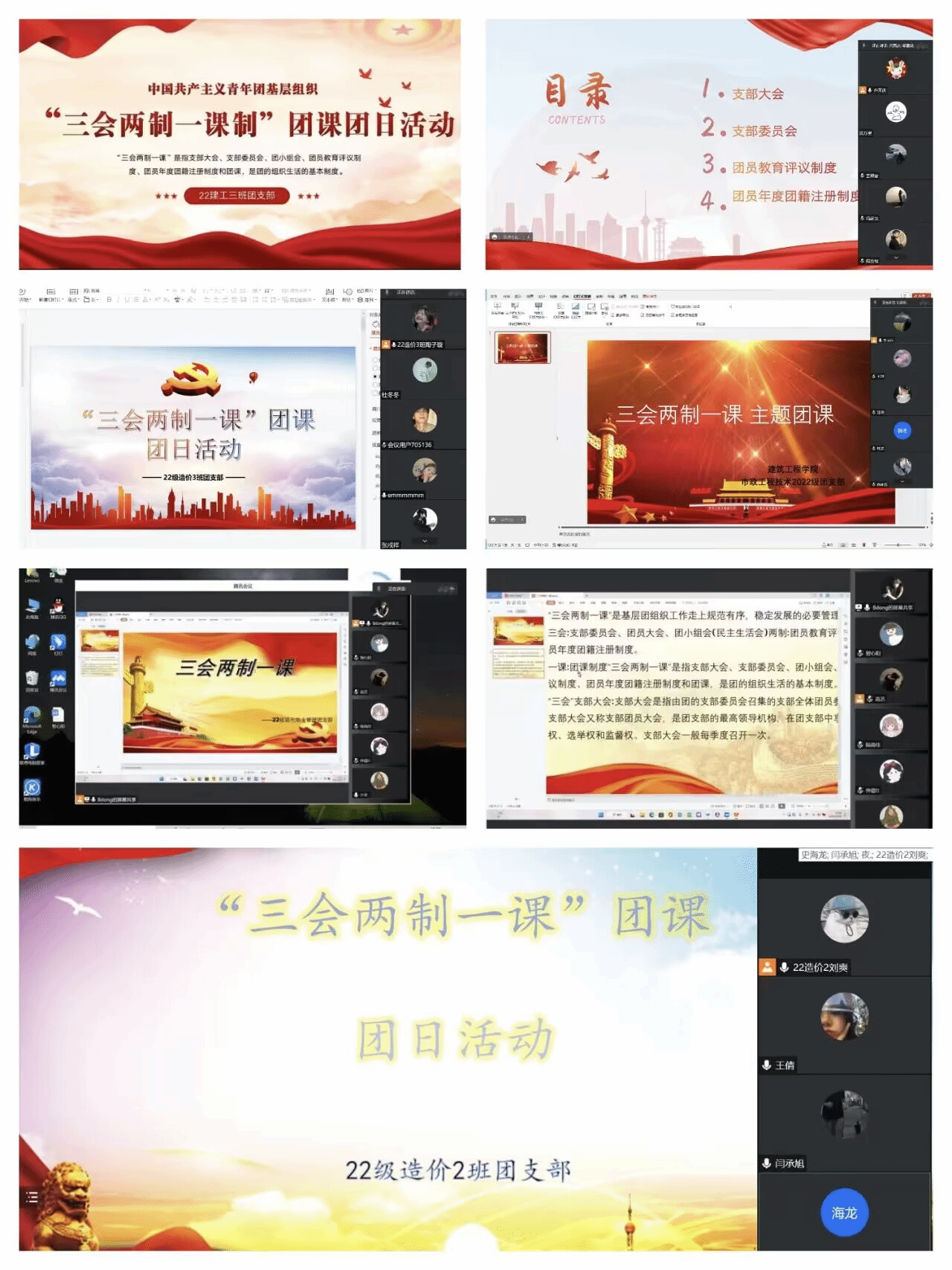 为健全共青团的组织生活,加强团支部管理,保持和增强团干部的政治性、先进性、群众性,加强团员思想政治教育和自我教育。建筑工程学院学院于12月2日在各班级开展“三会两制一课”主题活动。
