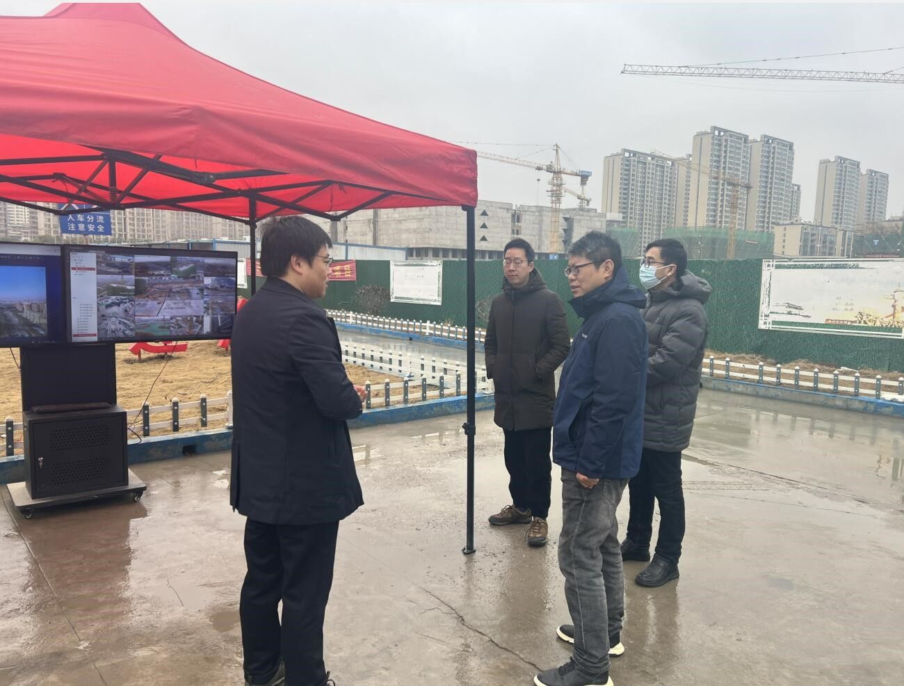 双方首先来到亭城文旅新悦城项目上,实地考察“智慧工地”。金鹏王晓杰仔细讲解了“智慧工地”平台的功能模块应用,包括人员管理、劳务实名制管理和考勤、材料与设备管理:塔机安全检测系统、吊钩可视化系统、塔机钢丝绳缆物联监测系统、施工升降机监控系统、危大工程管理系统等。