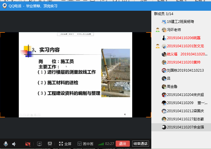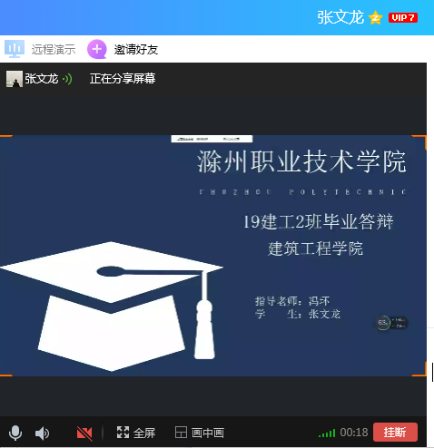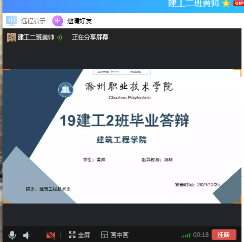 2022年4月,由于新冠肺炎疫情影响,密切关注学生毕业设计等任务完成情况。采取线上答辩,学生通过答辩PPT进行在线演示(QQ分享屏幕完成),这是在这个特殊时期的创新举措。
