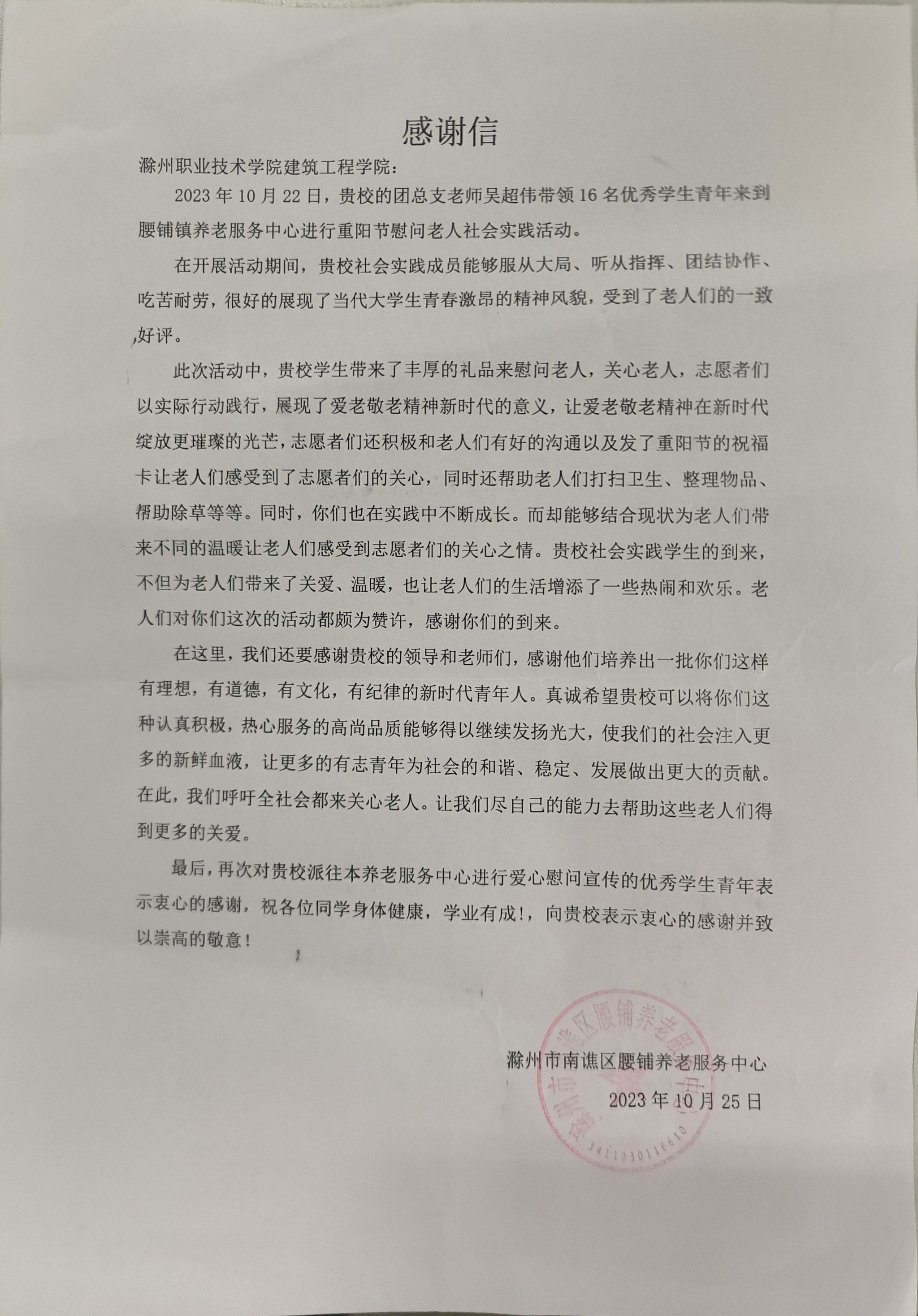近日,滁州市南谁区腰铺养老服务中心向金沙威尼斯官网建筑工程学院致感谢信,对金沙威尼斯官网建筑工程学院表示衷心的感谢并致以崇高的敬意。