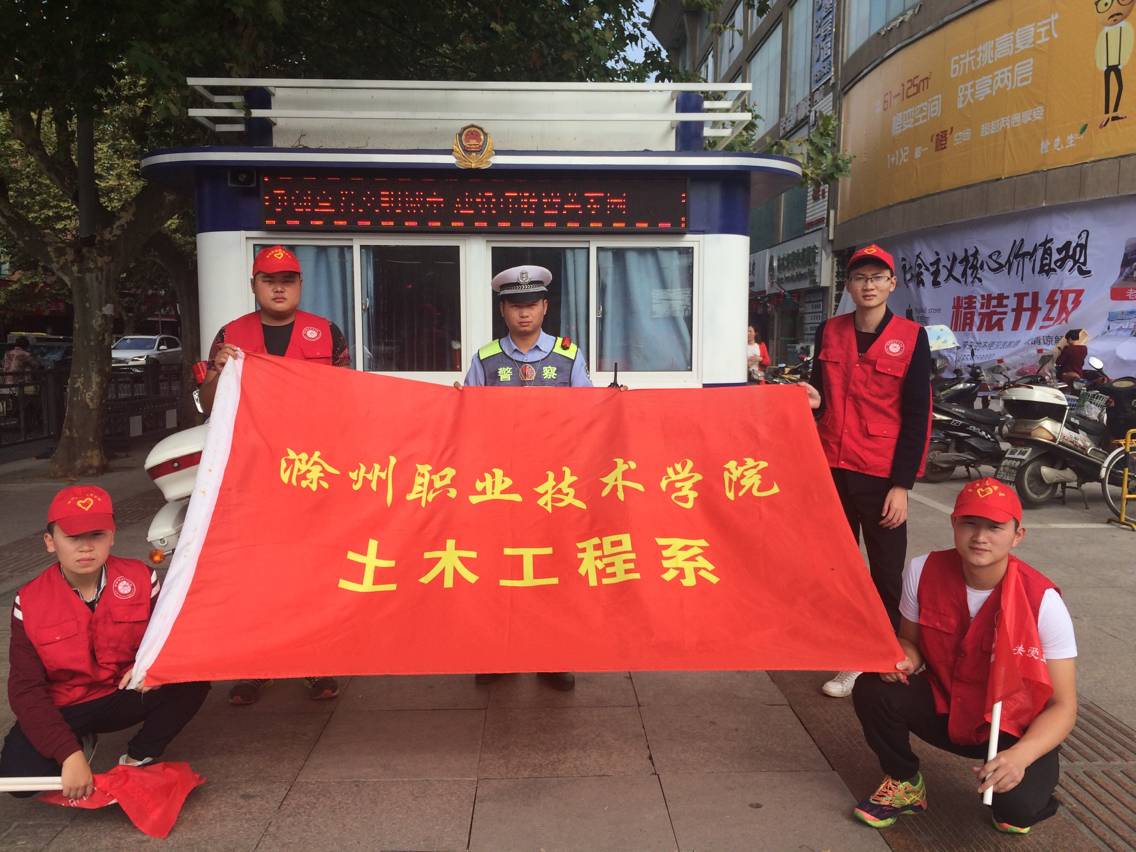 近日,为了积极配合全市文明创建工作,由土木系团总支组织部分学生在滁州市天长路和南谯路路口口协助交警指挥交通。为了更有效的协助指挥,团队分成几组进行,成员分别站在斑马线两侧进行指挥。