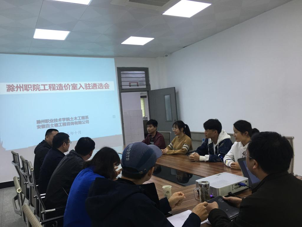 10月 25日上午,土木工程系造价工作室遴选学生入驻面试在位于致学楼六楼的造价工作室会议室里举行。此次面试将从前期报名申请的16、17级工程造价专业学生中挑选出符合要求的学生入驻到工作室里,采用师傅带徒弟的现代学徒制模式,按照现代职业环境开展专业实践训练及指导。来自土木工程系的专业课教师同安徽百士德工程咨询有限公司的企业负责人共同组成了面试考官,面试主要围绕“你认为步入社会后应具备的优秀品质有哪些”“你对未来的职业规划有什么打算”两个问题展开,参加面试的学生一一对这两个问题进行了思考回答,期间,安徽百士德工程咨询有限公司的企业负责人、专业课教师还同面试学生进行了交流。据了解,我院的造价工作室以来,按照与安徽百士德工程咨询有限公司签署的工作室合作协议,共接纳工程造价专业学生近100名,这些学生在造价工作室里通过真实项目实战实践,有力的增强了个人实践能力,为毕业后步入企业工作提供了扎实的能力基础。