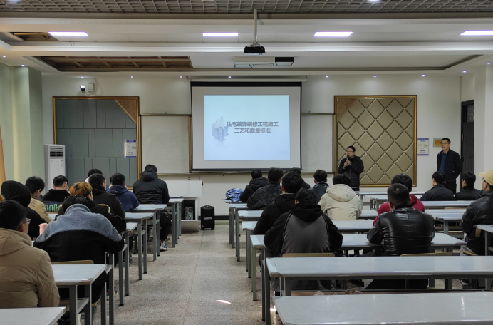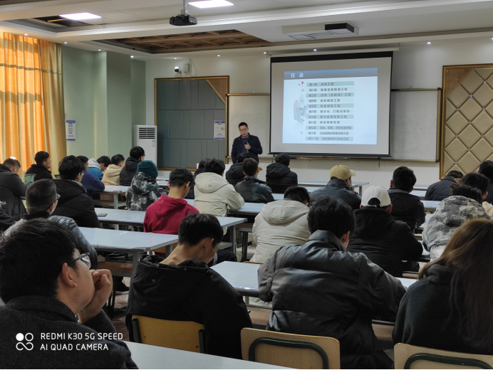 本次授课在建筑工程学院实训管建筑装饰一体化教室进行,郭副总工主要介绍了“建筑装饰装修”和“建筑工程防水”等相关内容,将企业丰富的案例和最新的施工方法引入课堂教学体系。在教学过程中,郭副总工对照教室内的装饰节点构造,将实际工程中优秀的案例和不合格的案例进行对比分析,让学生了解到企业对于装饰工程质量的要求和标准,教学效果良好。金鹏建设集团人力行政中心副总经理杨涛,金沙威尼斯官网建筑工程学院李西等教师旁听了课程。