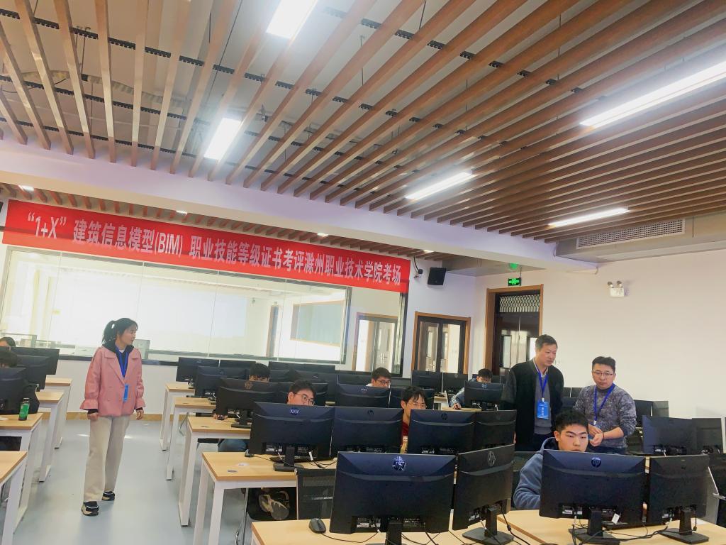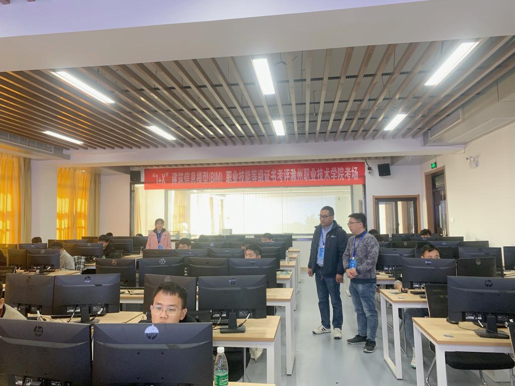 本次考试在建筑技术综合实训馆的1+X证书试点(BIM)实训室举行。建筑工程学院33名学生参加本次认证考试。此次考试工作组织有序、安排合理,建筑工程学院党总支书记刘文元,校实训中心副主任刘杰到现场指导工作。