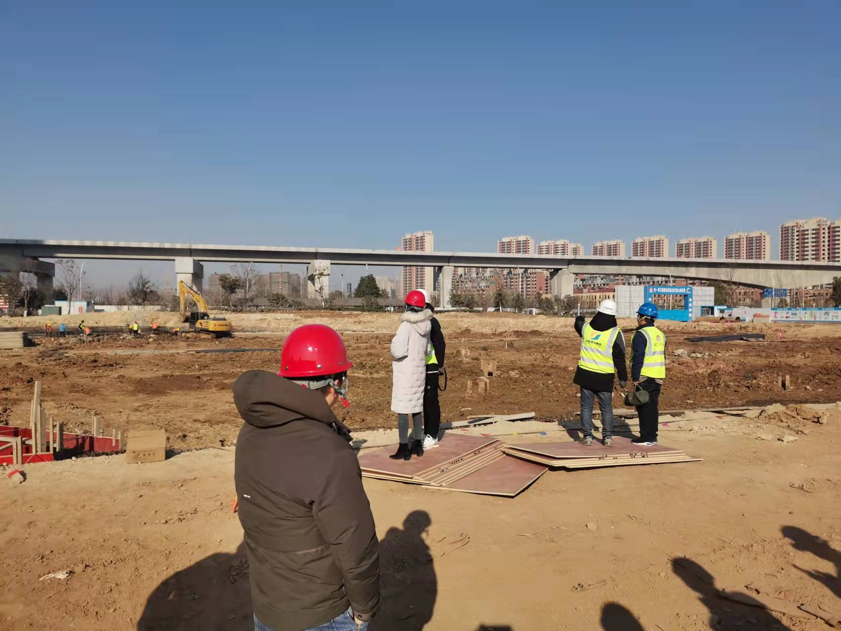 “苏滁科创中心”项目位于徽州路与中心二路交叉口东北侧,总建筑面积5.8万平方米,地上塔楼18层,裙房3层,地下3层,因邻近苏滁现代产业园管委会与轻轨高架,且基坑深度大,须直坡开挖,主要重、难点施工为地下工程,深基坑具有冠梁、格构柱、三轴搅拌桩,主体有高支模等多个技术点。中旭李经理带老师们参观了工程的情况。