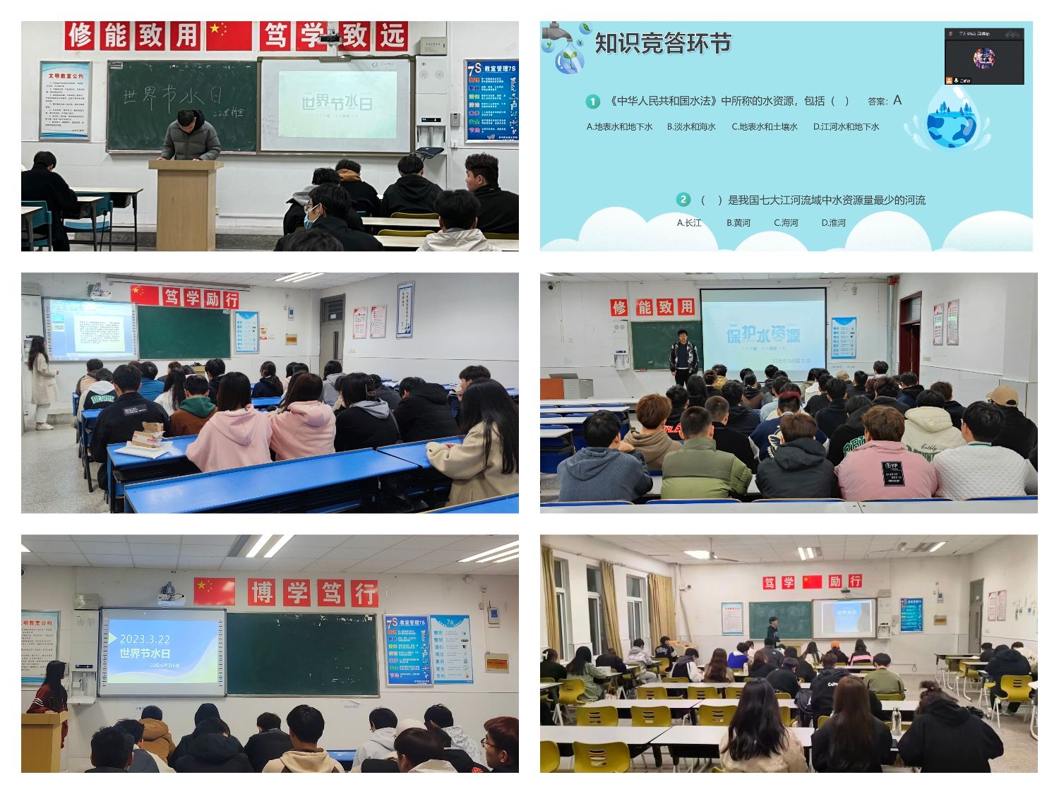 活动开始,各班班长上网查找资料制作PPT,用图文并茂的方式向同学们宣讲世界节水日的由来、如何节约用水及节水知识,使同学们认识到保护现有水资源的重要性,促使养成良好的用水习惯,坚决反对用水浪费的现象。
