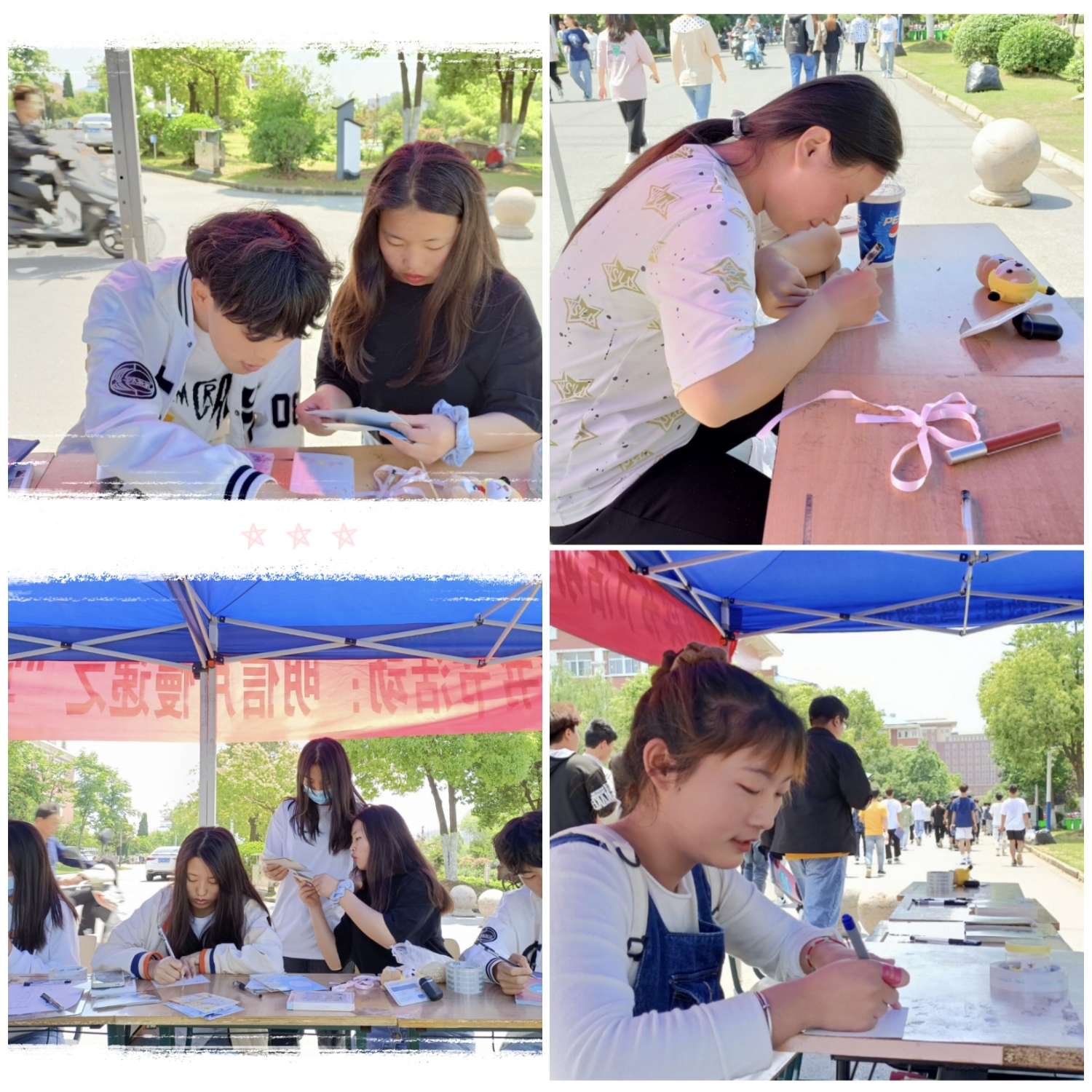 5月17日上午8点,校学生会学习部成员开始摆摊,从而拉开了此次明信片慢递之“写给未来的自己”活动的序幕。活动面向全校学生展开。路过摊点并有意向参加活动的同学,可在摊点领取一张明信片,在明信片上写下自己关于未来的话,再贴在读书节活动方案展板上,以供展示。
