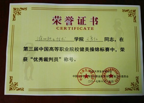 赛会期间王厚红老师遵守赛风赛纪,恪守道德底线,以饱满的热情和严谨的工作态度,向团队中多位国际级、国家级裁判虚心请教、学习,同团队成员齐心协力,保障了进比赛顺利进行。王厚红老师被组委会评为“优秀裁判员”荣誉称号。