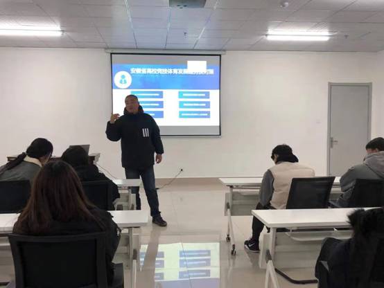 12月31日中午,孙强副教授在体育馆二楼多媒体教室开展了《安徽省高校竞技体育发展趋势及对策》的学术讲座,来自校各运动队代表60余人参加了讲座。