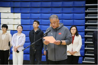 体育部主任孙强致辞,致辞中表示学校始终践行五育并举的育人理念,高度重视体育工作,始终坚持按照习近平总书记关于让学生在体育锻炼中享受乐趣、增强体质、健全人格、锤炼意志的总要求,不断深化学校体育工作改革。强化体育的“以体育人”“以体育智”“以体育心”的育人功能。本届校园体育文化节提出了“运动扬公平 竞赛享乐趣”的办赛口号,希望同学们通过顽强拼搏、公平竞争,来阐述奥林匹克精神。