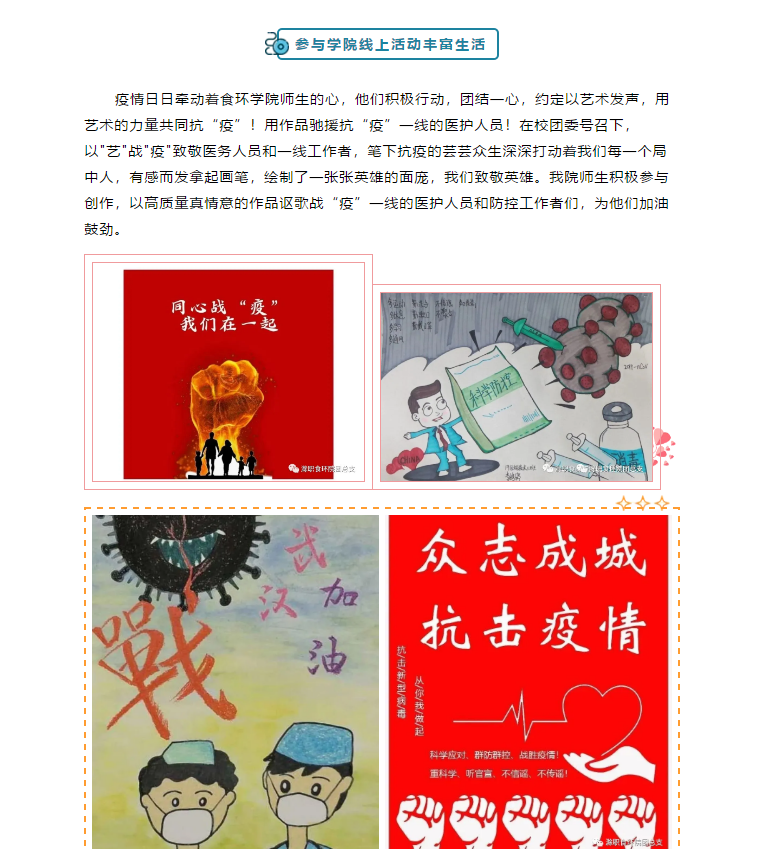 本次活动通过学习通心理健康的学习和各位辅导员进行线上活动的开展以及食环学院公众号的宣传,同学们积极参加,在家里用自己的行动证明了对抗击疫情的决心,绘制了一张张英雄的面庞,致敬我们的英雄。
