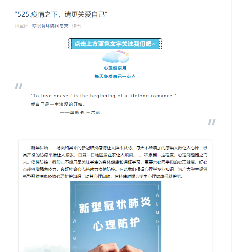 另外,食环学院充分利用学院公众号大力宣传有关疫情防控期间的心理健康知识,让学生了解自己的各种心理反应,了解疫情心理危机发展变化的过程,引导学生如何帮助身边亲人、朋友缓解疫情下可能产生的恐慌、焦虑、愤怒等负性情绪。