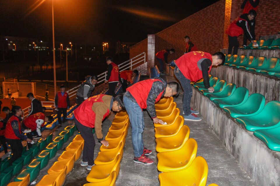 美丽的校园里,在学院运动会来临之际,2016年11月1日晚,汽车工程系志愿者在团总支书记朱婷婷老师的带领下来到了学院的运动操场,开展践行核心价值观“美化校园 从我做起”义务劳动,本次活动主要是清理运动场垃圾,擦洗座椅等,为第二天的运动会开幕式做好准备,并倡议同学们爱护校园环境,从我们每一位同学做起。