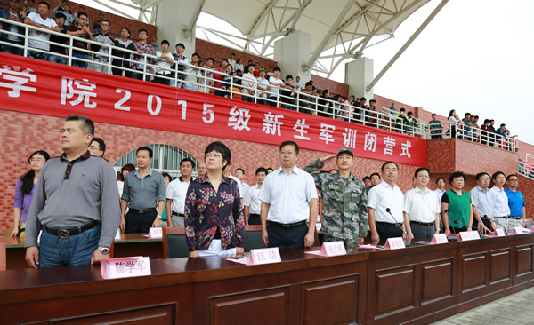 9月29日下午,金沙威尼斯欢乐娱人城2015级新生军训闭营仪式在学院体育场隆重举行。院领导杨甫祥、李柱梁、刘树俭、吴大明、程一斌、江洁、汪上、陈学军、刘宏和部队首长出席闭营式。全体军训教官、各系部处室负责人、教师代表、2015级辅导员以及2015级全体新生参加了本次闭营式。闭营式由院长李柱梁主持。