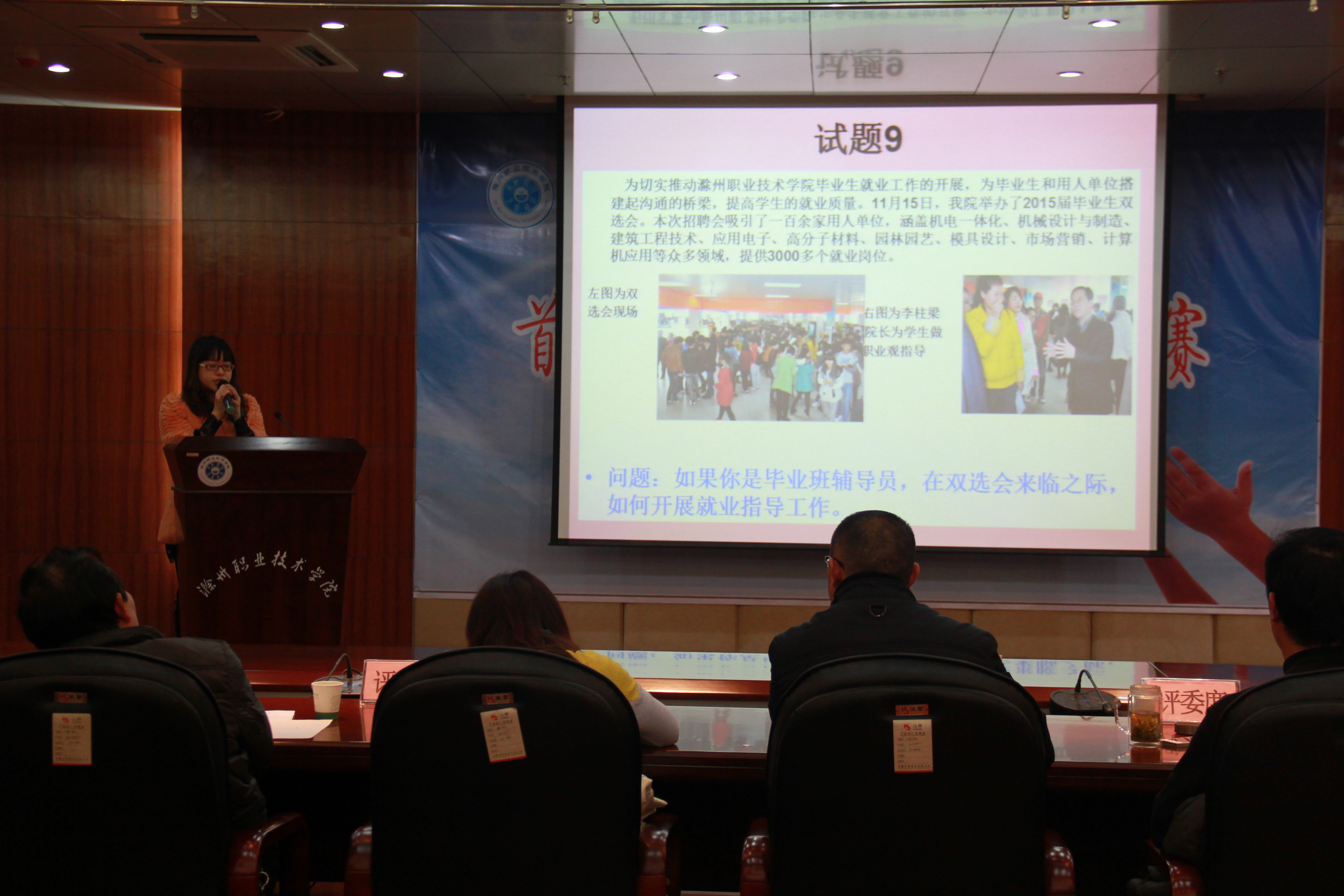 为促进辅导员熟练掌握基本工作技能,不断提升业务素质和工作水平,充分展示辅导员队伍朝气蓬勃、奋发向上的精神风貌,金沙威尼斯欢乐娱人城于12月8至9日举办了首届辅导员职业技能比赛。党委书记张勇、院长李柱梁、副院长汪上、院长助理刘宏亲临比赛现场指导比赛。组织人事处、学生处、招生就业处、保卫处、团委、基础部、督导室、职教研究所、图书馆、技师学院等部门负责人担任此次比赛评委。学院全体专职辅导员和部分学生干部观摩比赛。