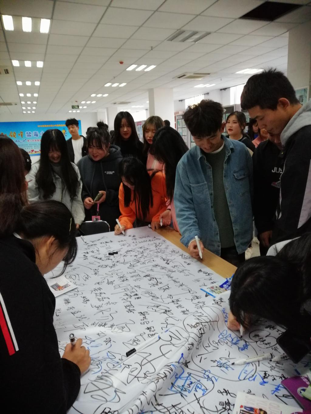 在讲解员的引导下,同学们首先来到展板前,学习历届国家领导对禁毒工作的讲话精神,接着学习了关于禁毒方面的法律法规,了解我国虎门销烟以来的禁毒历史及现今我市禁毒现状,并与市禁毒办工作人员交流讨论。然后来到一个个排列整齐的毒品样品展示柜旁,认真辨识各种类型毒品的形状和颜色,详细了解它们会产生什么样的感觉和毒害,以及毒品对家庭、社会造成的极端危害。随后观看了我市禁毒成果教育宣传和文化宣传获奖作品,最后,同学们来到签字桌前郑重签名。期间部分学生在禁毒办的引导下,庄严宣誓“珍惜生命,拒绝毒品”。