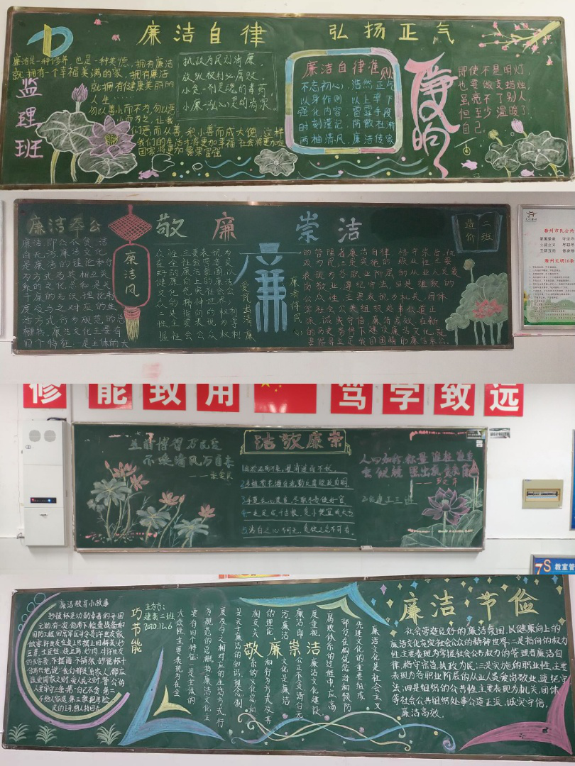 为推进食品与环境工程学院廉洁文化建设,提高廉政文化在校园的影响力,营造廉洁从教的育人环境,食品与环境工程学院各班级于12月10-17日出制了一期以“廉洁”为主题的黑板报。
