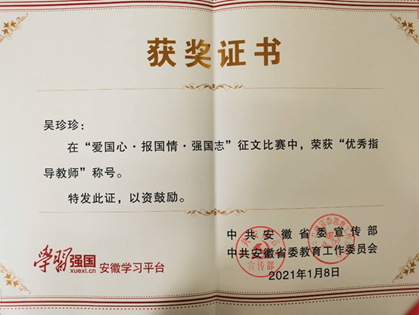 自2020年8月活动启动以来,“学习强国”安徽学习平台通过供稿链路、邮箱、海投系统三个渠道共收到稿件5637篇,经组委会专家评审组评审,大学组决选出一等奖1名,二等奖3名,三等奖10名。在与众多优秀选手的同台竞争中,金沙威尼斯官网管理学院张荣烁同学喜获二等奖,管理学院吴珍珍老师荣获优秀指导老师荣誉称号。