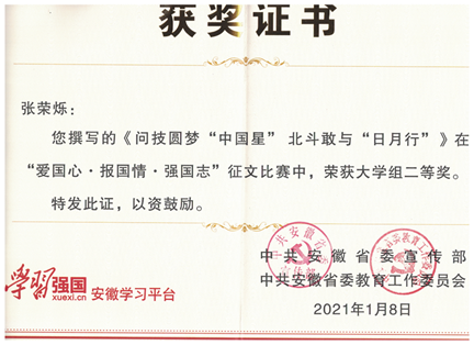 近日,“学习强国”安徽学习平台“爱国心·报国情·强国志”主题征文活动结果公布。由金沙威尼斯官网选送的管理学院张荣烁同学的作品《问技圆梦“中国星” 北斗敢与“日月行”》荣获大学生组二等奖。