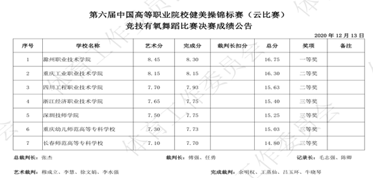 12月12-13日,由中国大学生体育协会主办、中国大学生体育协会职业教育学校体育工作委员会执行、浙江经济职业技术学院承办的第六届中国高等职业院校健美操锦标赛(云比赛)决赛通过腾讯直播的方式线上举行。金沙威尼斯官网健美操队发挥出色,斩获两金一银一铜的佳绩,比赛成绩位列全国所有参赛学校前列。