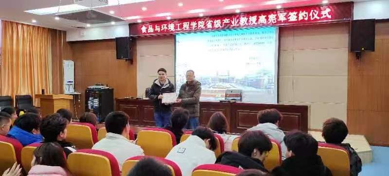 2023年1月3日上午,省级产业教授、安徽省东鹏食品饮料有限公司质量处经理高宪军在南阶205为绿色食品生产技术专业和食品检验检测技术专业在校学生开展“食品专业的前景和就业”讲座。食环学院院长梁建军和食品教研室主任陈静参加了此次讲座,同时举行了省级产业教授签约仪式,并颁发了聘书。