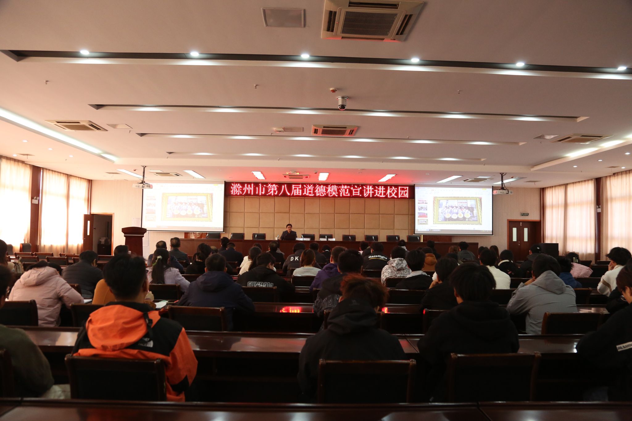 为加强思想道德建设,充分发挥“身边好人”在学校精神文明建设中的示范引领作用,金沙威尼斯官网举办道德模范宣讲进校园系列活动。本次邀请到滁州市第八届爱岗敬业道德模范邓凡江来校宣讲。宣讲会由校党委委员、宣传统战部部长王冬主持。师生代表共计200人参加。