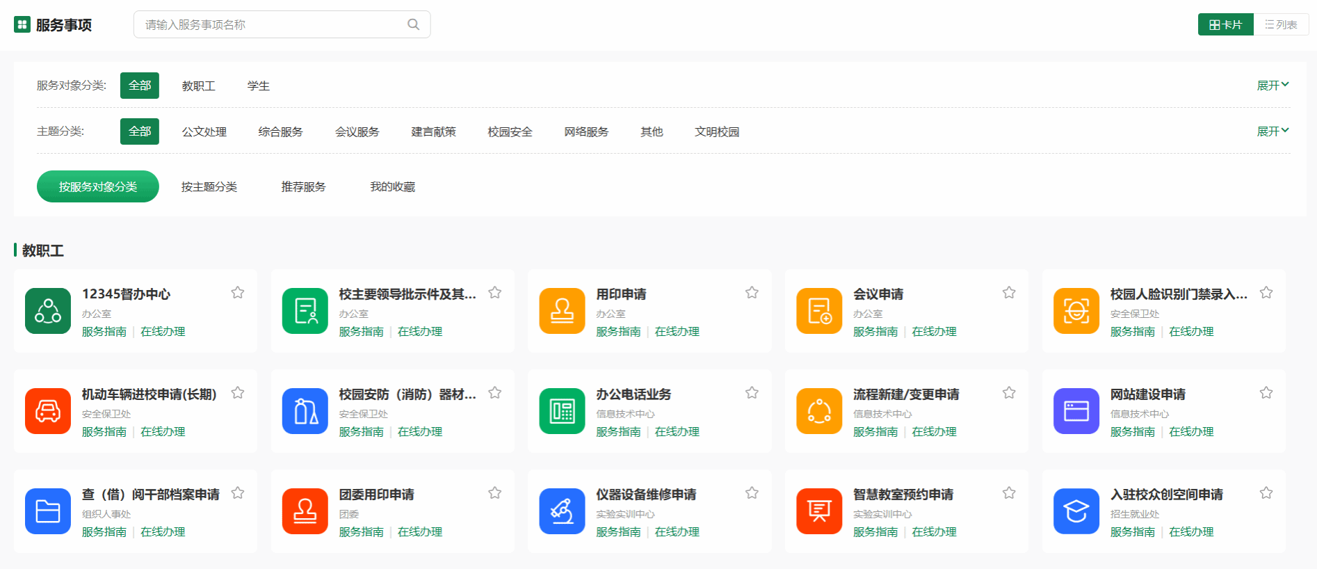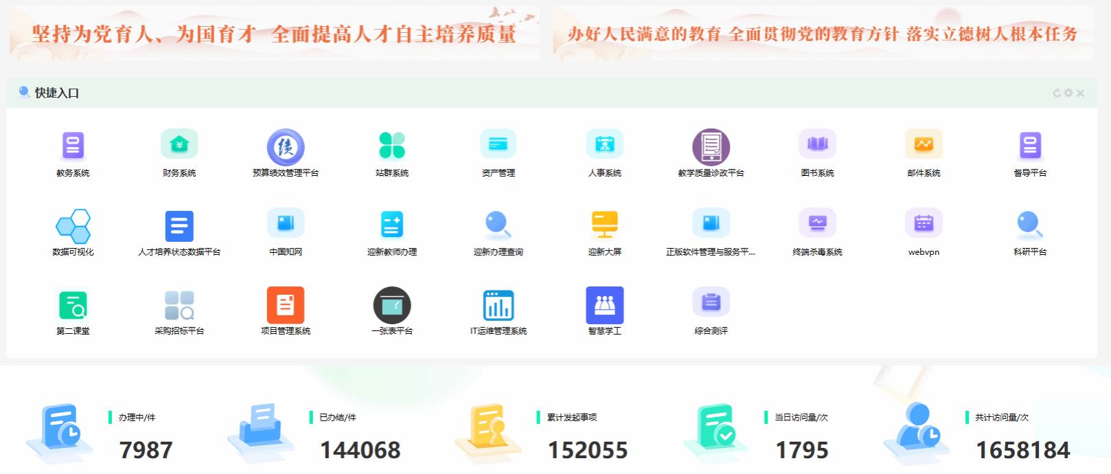 建成网上办事大厅,打通线上线下,实现业务“网上办、掌上办、马上办”,极大提升师生的信息化获得感。大厅于2023年上线运行,共上线校务服务事项73项。