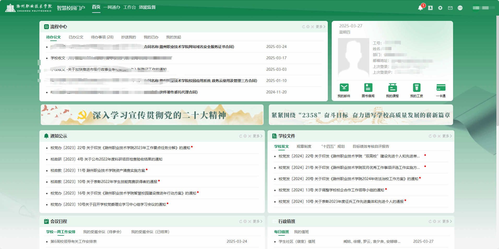 学校建成智慧校园系统,为在校师生提供基础服务,覆盖办公、教学、学工、科研、生活等业务域,覆盖校园内所有人群,业务支持PC端、移动端,可以通过浏览器、微信等多种方式进行访问。