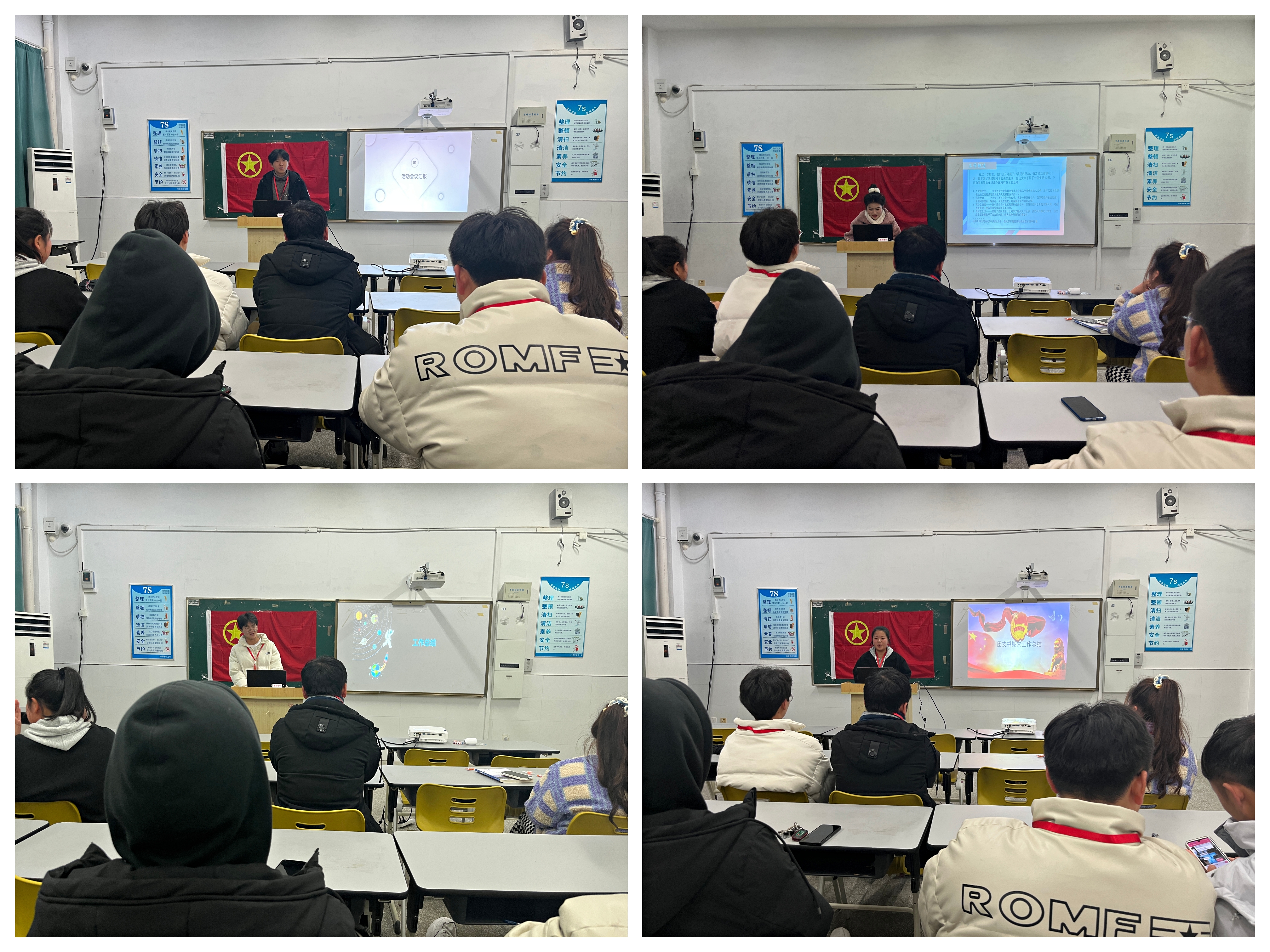 首先,由团总支各部门干事对这学期的工作做出详细总结,列举相关工作事项,并对下学期的工作安排做了简单的概述。接着,实践部各班团支书以讲ppt的形式讲述本班团支部在学期工作中仍然存在的问题和不足之处,他们都认真的总结问题,并做好反思工作。随后,团总支副书记王乐总结各部门相关工作完成情况和一些需要改进的地方,并希望各部门在今后的工作中继续努力,不断提高老师和同学对团总支工作的满意度。最后,副书记表示临近期末,希望学生团干要以身作则,做好带头作用,认真备考,做到诚信考试,在考试中不作弊,并预祝全体学生团干在期末考试中取得优异成绩。