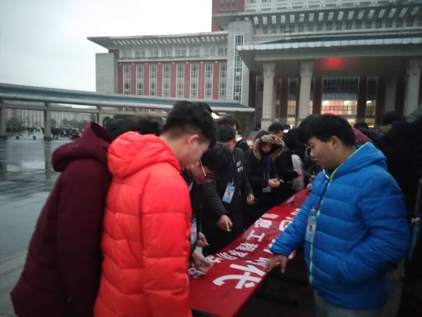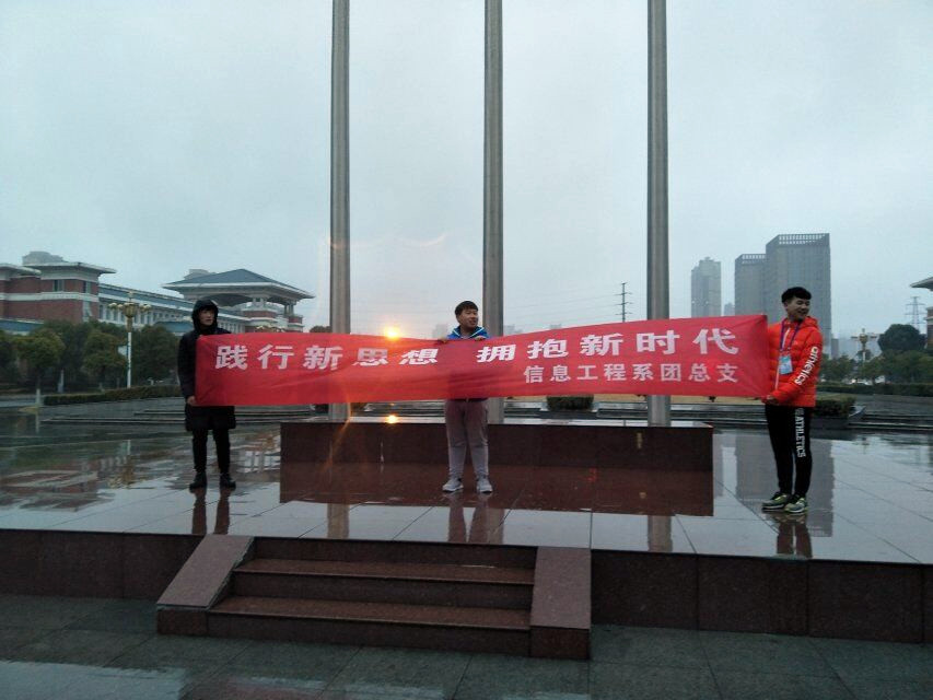2018年1月3日清晨,天还没亮,金沙威尼斯欢乐娱人城综合楼前广场上已经聚集了整齐的队伍,信息工程系团总支和学生会冒着蒙蒙细雨和凌冽的寒风,组织了团员和学干代表举行了“践行新思想 拥抱新时代”主题升旗活动,仪式结束后,同学们陆续在条幅上签名,表达了滁职学子生永远跟党走,青春献祖国的决心。