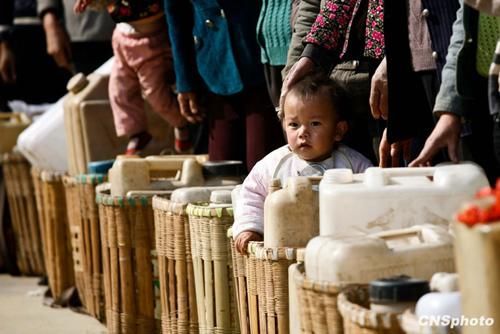 3月12日,云南省富源县小羊场村,1名儿童随母亲来到村口排队取水。