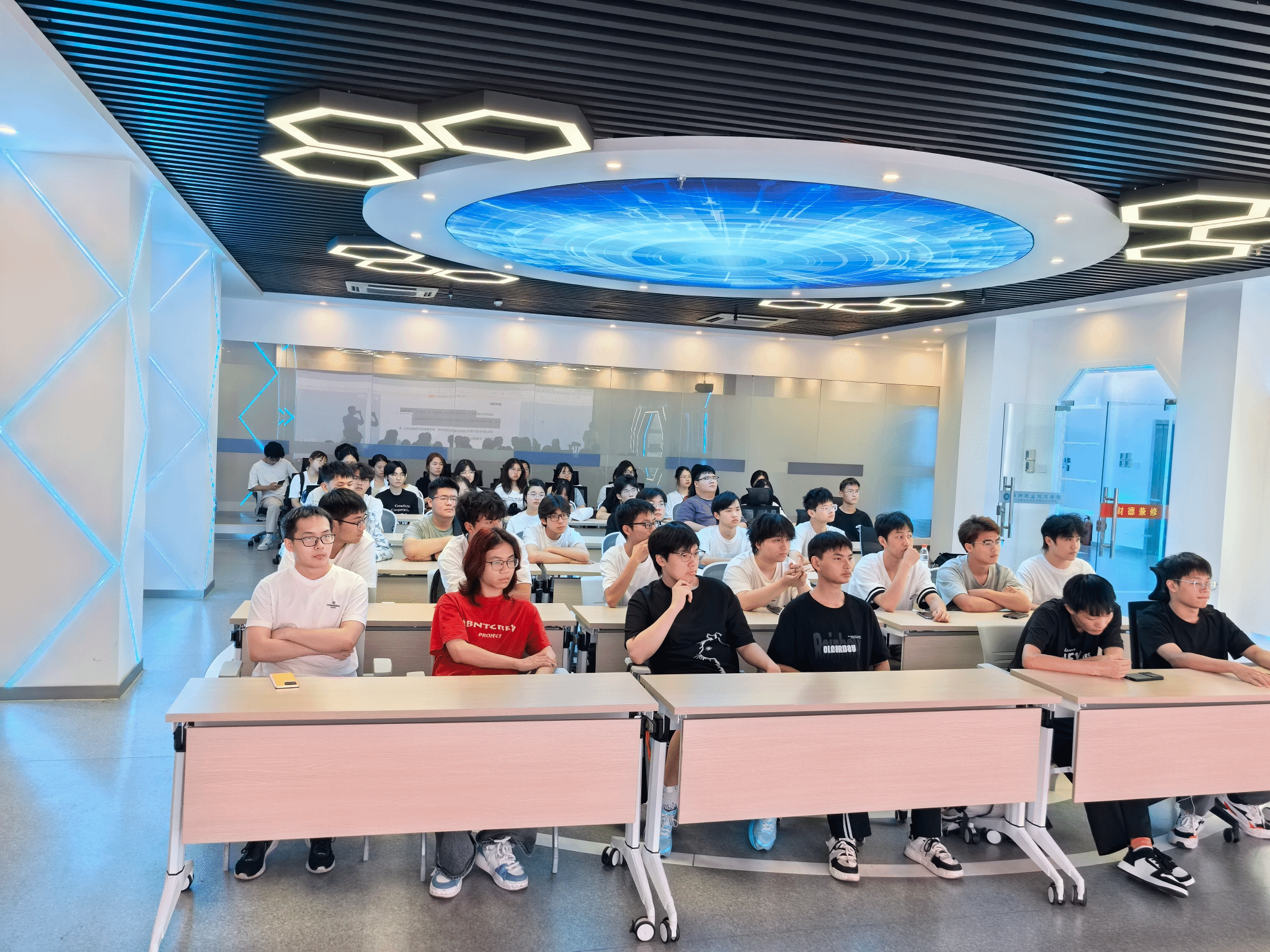 在充满科技感的VR实训中心,鲁家成老师首先通过一段震撼的VR全景视频,带领新生们"穿越"到未来职场场景。随后,鲁老师从行业发展、专业特色、课程体系、就业前景四个方面进行了详细介绍。