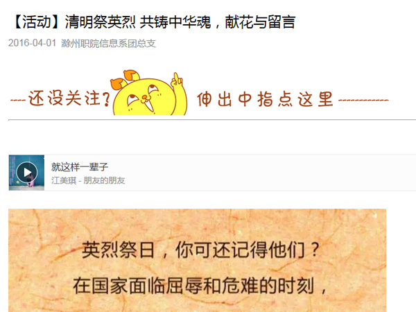 各团支部纷纷响应此次活动,登录国家公祭网、中华英烈网等主题祭奠网站,通过网上献花、点烛、留言等方式,追思先辈们英雄足迹,表达对英烈的哀思和缅怀。除此,我系团总支还以新媒体为载体,如腾讯微博、新浪微博、微信、QQ空间,开展宣传教育等活动。
