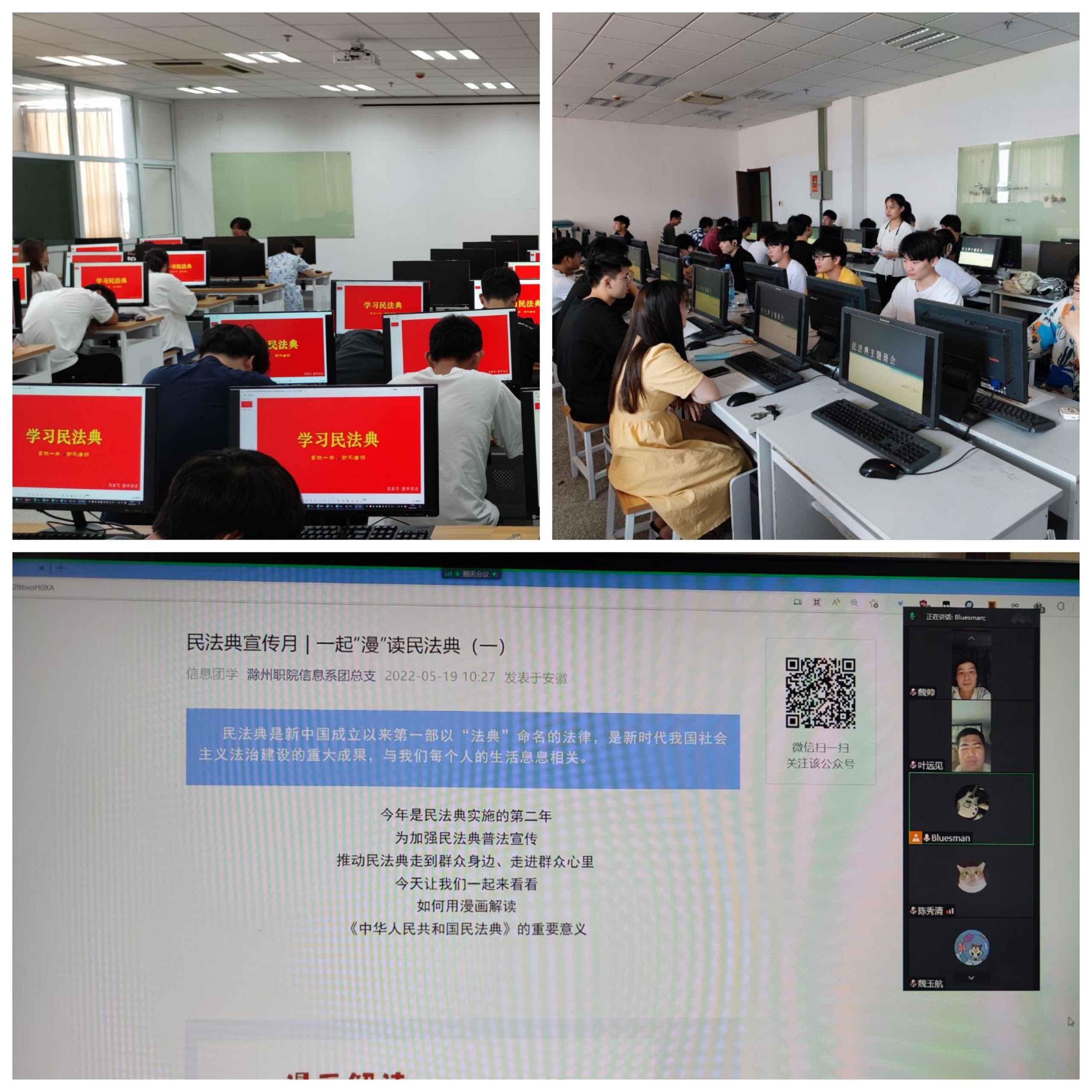 一是民法典主题班会。信息工程学院各班辅导员积极组织班级同学召开主题班会。班会上,各班辅导员对学生进行民法相关知识的宣传教育,解读了民法典出台的重大意义和相关法律法规。