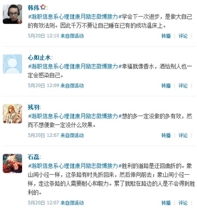 5月20日至5月21日信息工程系在腾讯微博开展了心理健康月励志微博接力活动。此次活动得到同学们的热烈响应,同学们纷纷大声在网络上说出自己想说出的话,或者转发励志座右铭,互动热烈。本次活动帮助同学们树立积极健康的人生观、培养健康生活理念,丰富同学们的校园生活,促进同学之间的沟通与交流。