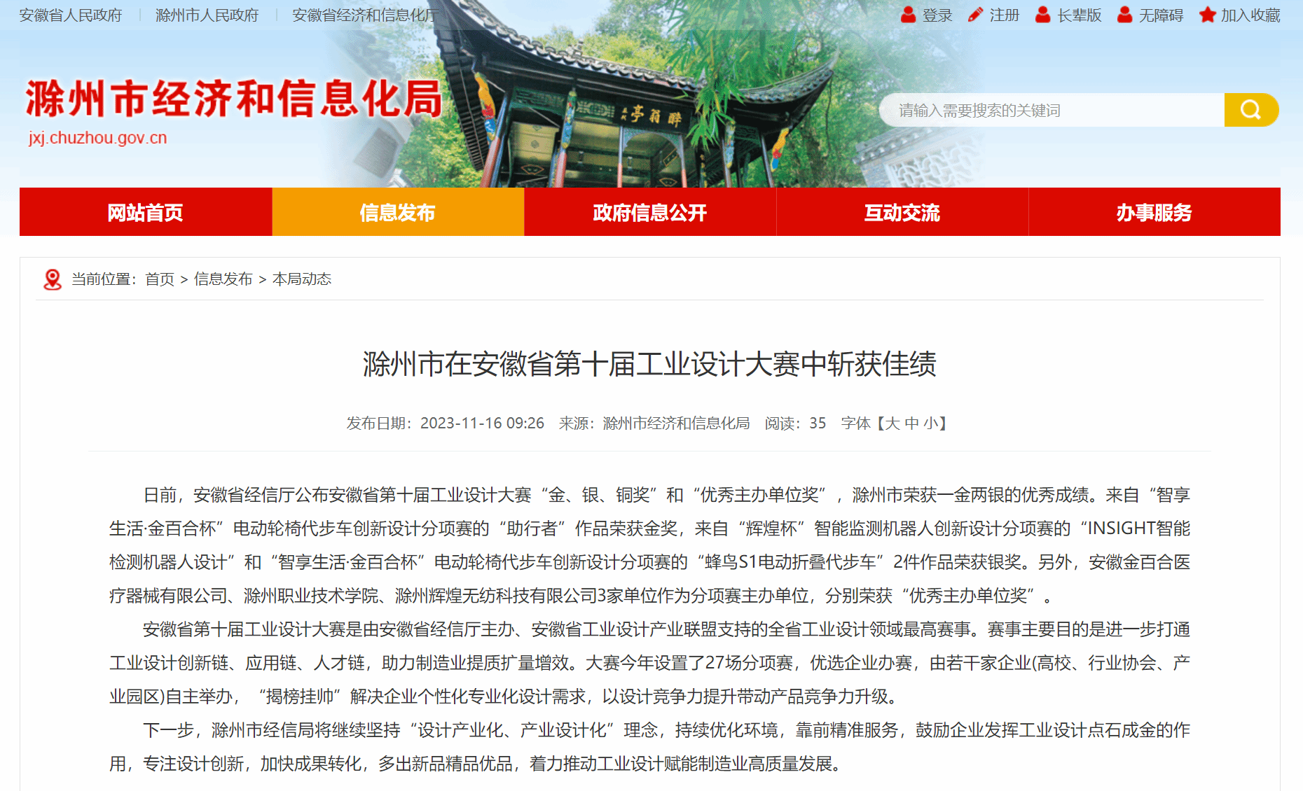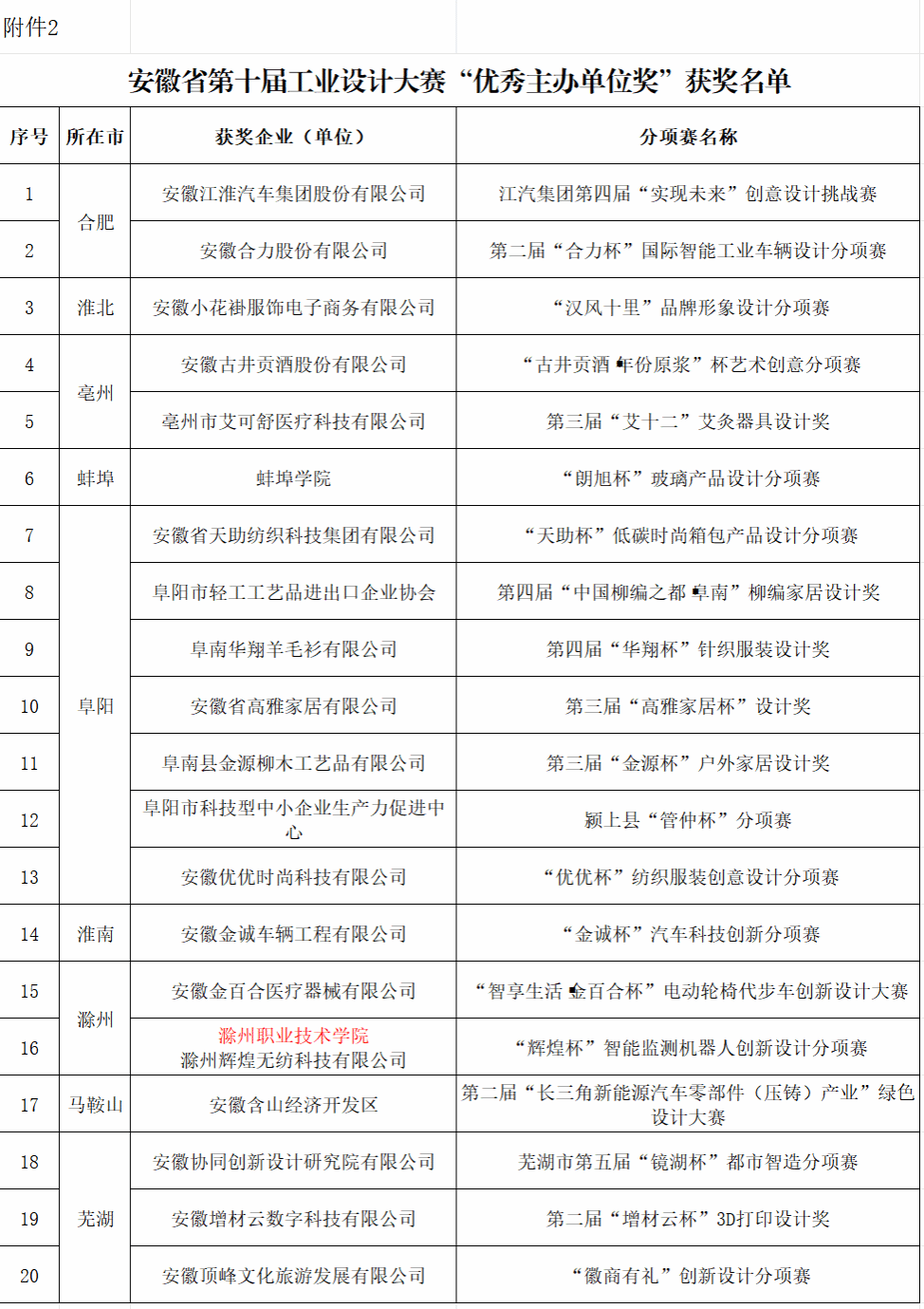 近日,安徽省经信厅公布安徽省第十届工业设计大赛优秀主办单位,金沙威尼斯欢乐娱人城和滁州辉煌无纺科技有限公司作为“辉煌杯”智能监测机器人创新设计分项赛主办单位,荣获“优秀主办单位奖”。是省内唯一主办分项赛和获得优秀主办单位奖的高职院校。